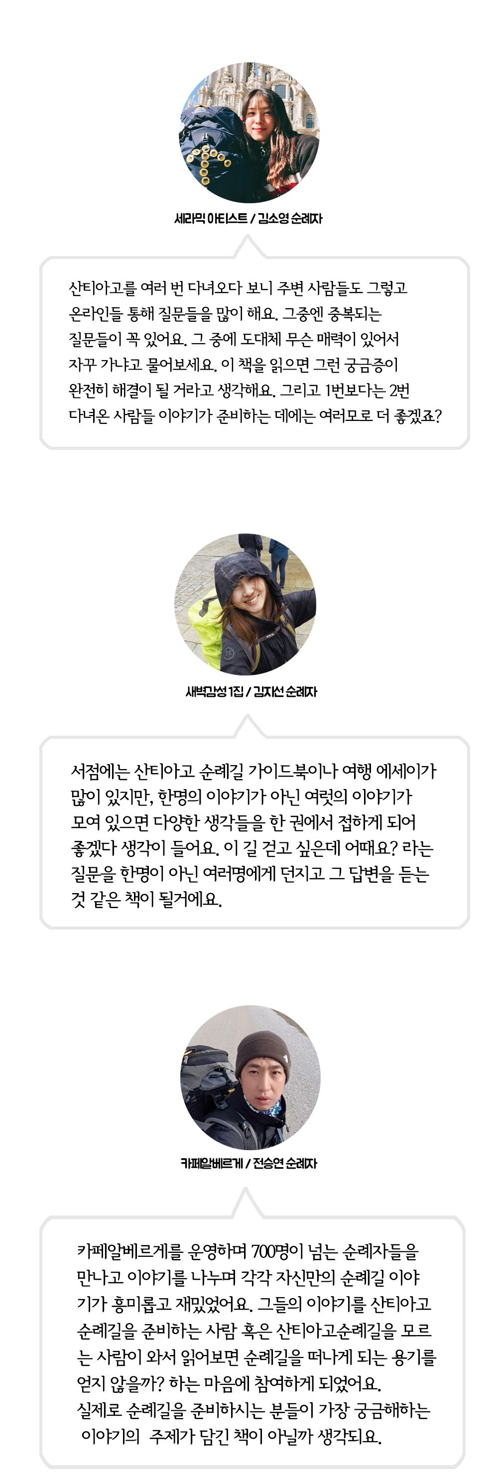 23명의 사람들에게 원고를 받고 읽어보는데 눈시울이 붉어지기도 했습니다. 한 사람 한 사람의 생생한 마음의 이야기에 제 마음 또한 움직였습니다. 산티아고 순례길이 사람들에게 어떤 영향을 미치는지 왜 그렇게 갈망하는지 또 가고싶어하는지, 딱히 묻지 않아도 우리들끼리는 그 이유를 알고 있었지만 그 이유 속의 진짜 이유를 읽고 나니 산티아고가 더 좋아졌습니다.