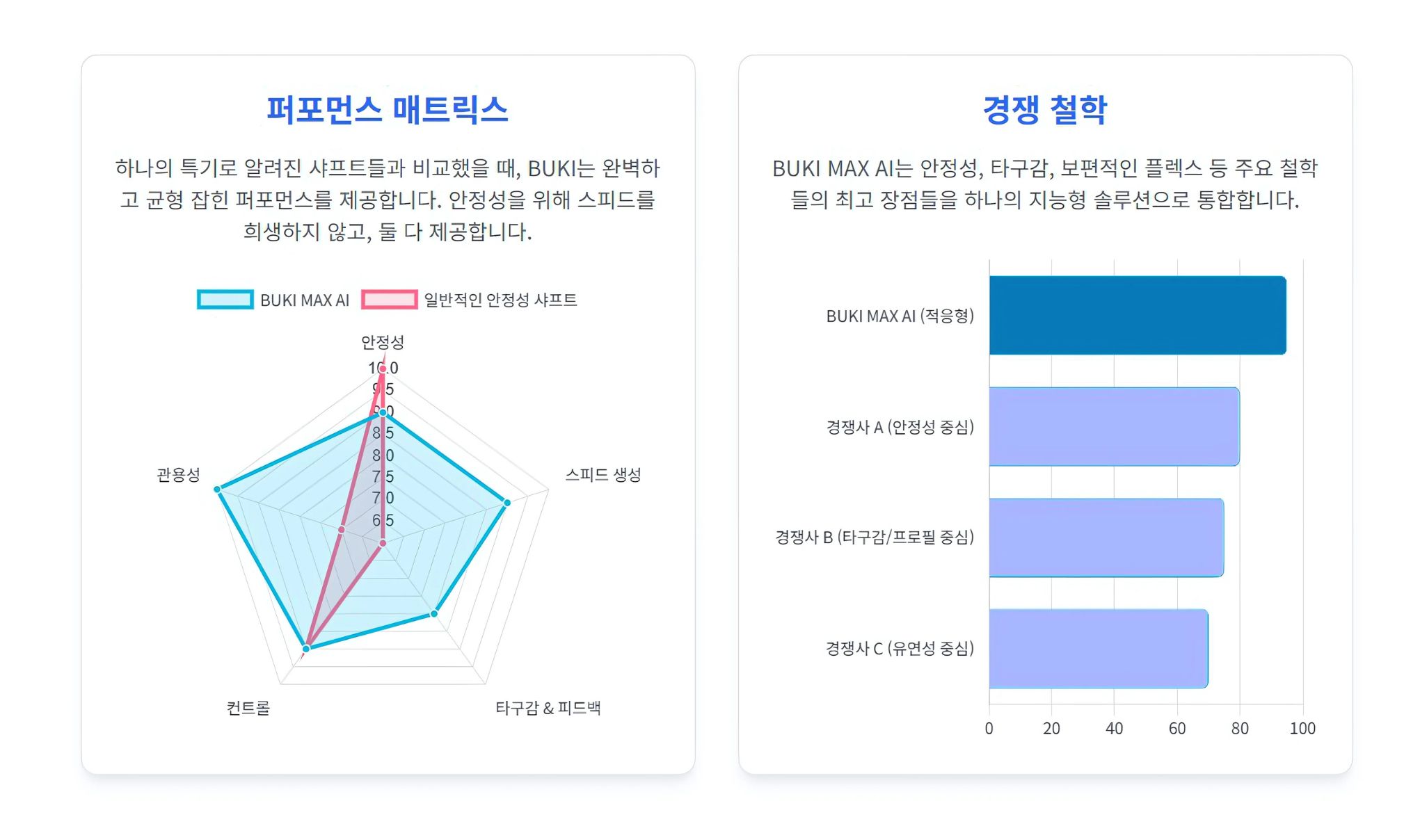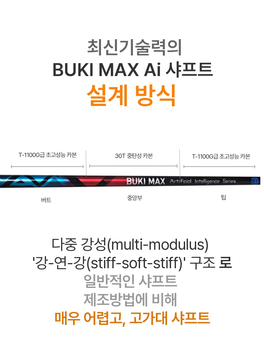 이 질문이 BUKI MAX AI 프로젝트의 시작이었습니다. 저희는 스윙 스피드에 따라 스스로 강성이 변하는 '지능형 폴리머' 기술과, 최첨단 카본 소재를 결합하여 어떤 스윙에서도 최적의 성능을 내는 샤프트를 만들고자 했습니다. BUKI MAX AI Artifical Intelligence Series는 골퍼들의 끝없는 장비 고민을 종결시키고, 오직 스윙에만 집중할 수 있는 즐거움을 돌려드리고자 하는 저희의 진심이 담긴 결과물입니다.