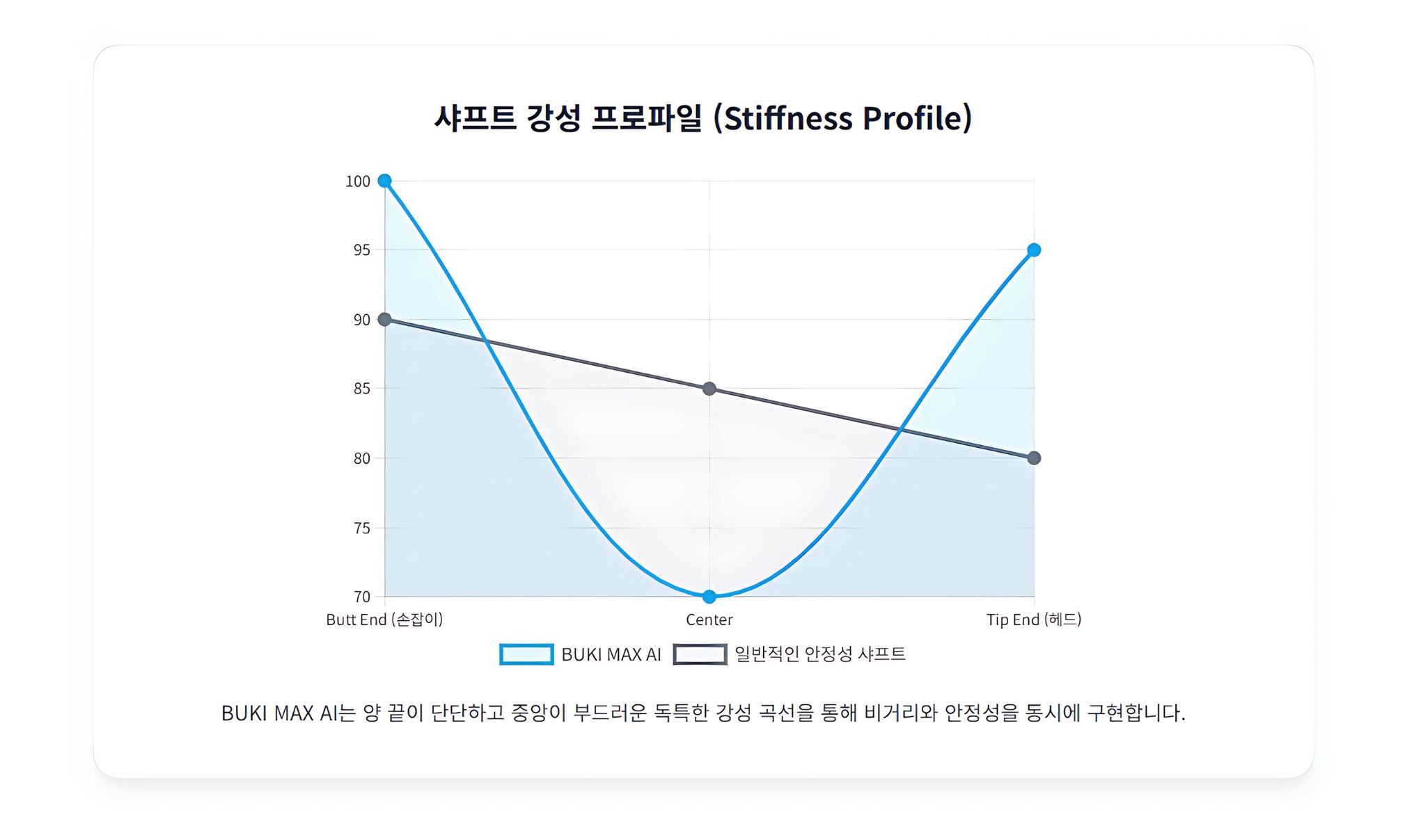 둘째, '전통적인 미드킥 샤프트'는 부드러운 역 U자 형태를 보이며, 중앙부가 부드럽지만 다중 강성 설계만큼 극단적인 차이를 보이지는 않습니다. 마지막으로, 'Buki Max (강-연-강)'는 양 끝단이 높고 중앙부가 뚜렷하게 움푹 들어간 U자형 곡선을 나타낼 것입니다. 이 시각적 비교는 Buki Max의 공학적 의도를 명확하게 정의합니다.