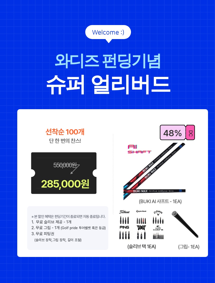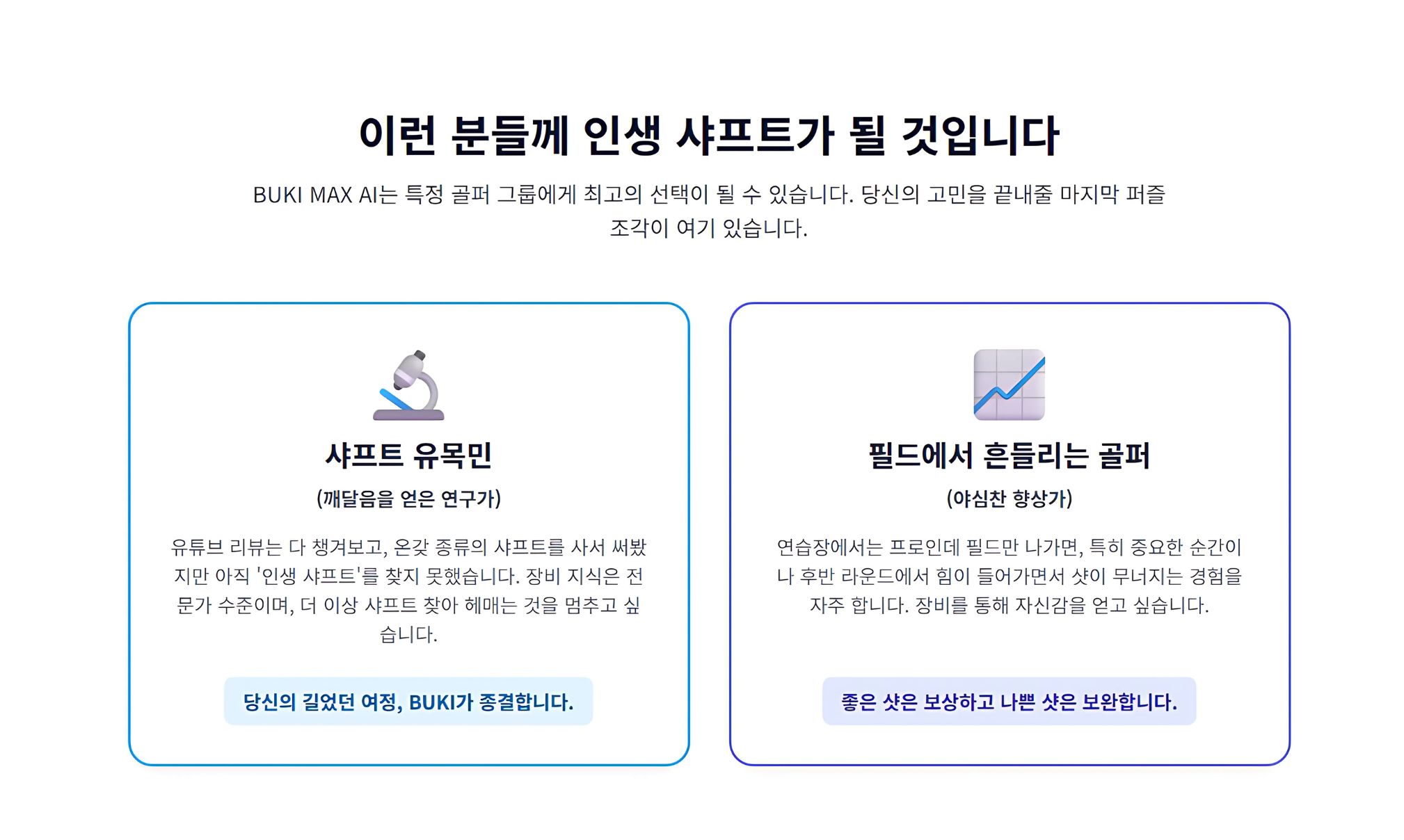 가장 먼저, 가장 솔직한 피드백을 얻기 위해:BUKI MAX AI Artifical Intelligence Series는 저희가 겪었던 '골퍼의 역설'이라는 문제에서 출발했습니다. 저희는 이 솔루션이 과연 다른 골퍼들에게도 통할지, 그들의 진짜 목소리를 듣고 싶었습니다. 와디즈의 서포터님들은 새로운 기술에 대한 이해도가 높고, 제품의 가치를 가장 먼저 알아봐 주시는 분들입니다. 서포터님들의 솔직한 피드백은 저희가 앞으로 나아갈 방향을 정하는 가장 중요한 나침반이 될 것입니다.
