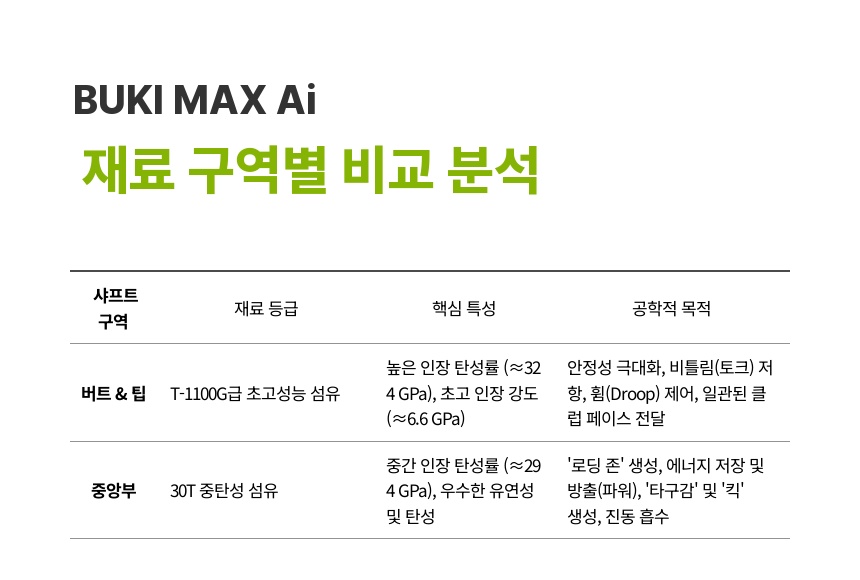 Buki Max 설계에서의 역할: 이 재료를 중앙 부분에 배치한 것은 특정 '휨 구간(bending zone)'을 만들기 위함입니다. 이곳은 샤프트가 에너지를 저장하고 방출하는 주된 영역으로, 파워 생성의 엔진이자 골퍼가 '타구감'과 '킥'을 느끼는 원천이 됩니다. 이는 강도, 유연성, 무게의 균형을 맞춘 핵심 재료입니다.