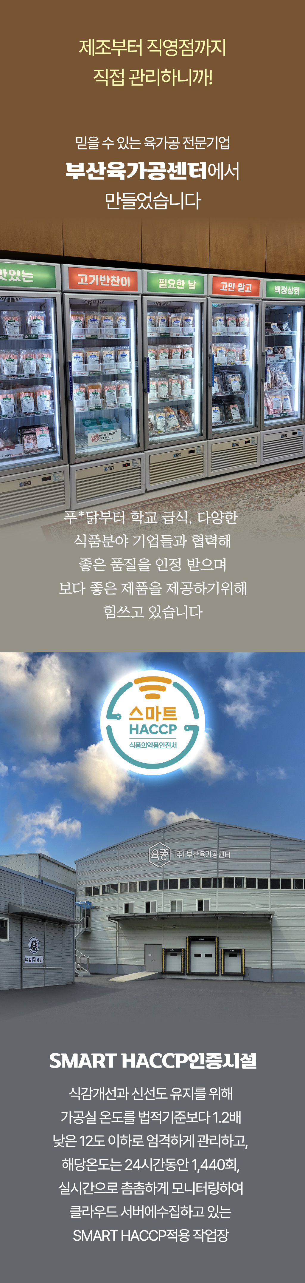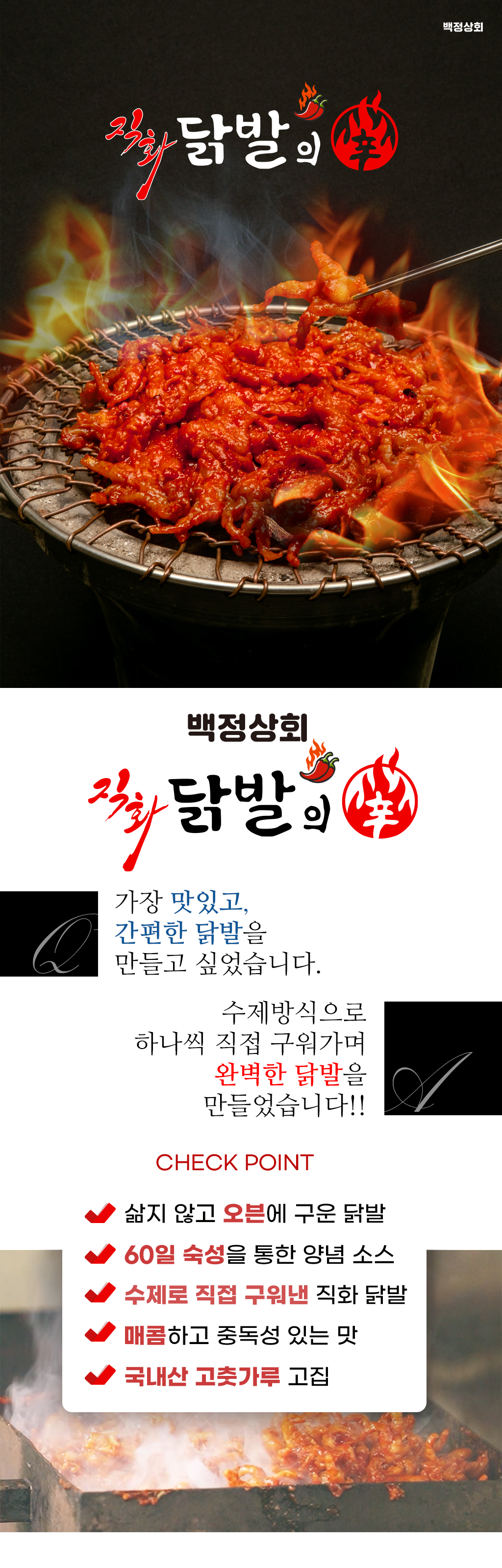 바쁜 일상속에서 간편하게 조리하여 맛있게 먹을 수 있는 닭발을 만들기 위하여 25년 경력 육가공전문가와 평균 경력 10년 이상의 각 분야별 전문가로 이뤄진 특별팀을 구성하고 기존 다양한 제품들의 장점만을 조합하여 최고의 제품을 만들어 보았습니다.