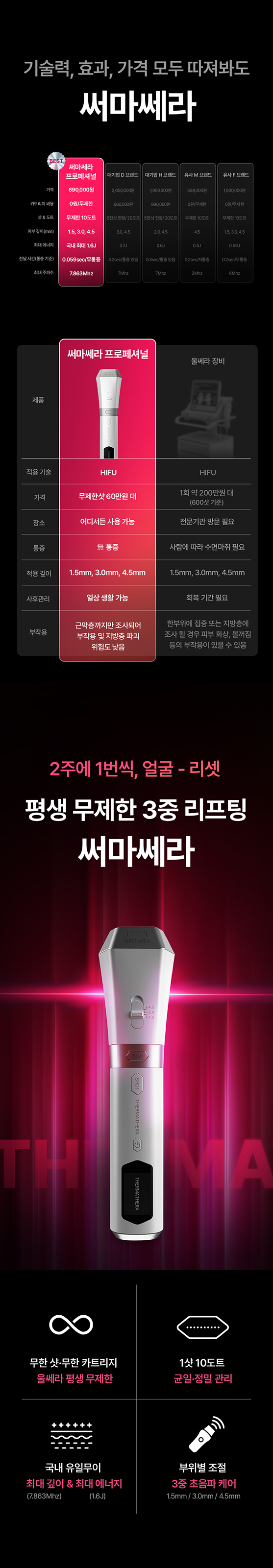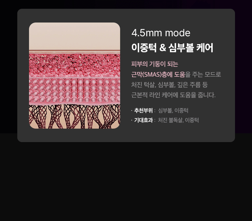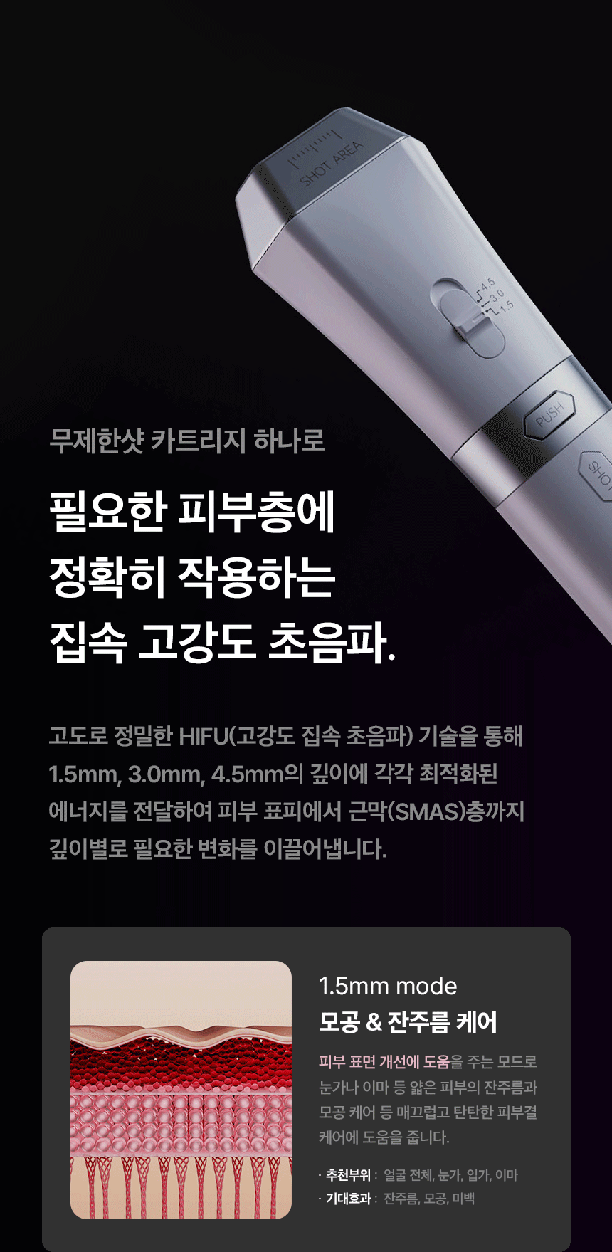 1.5mm ~ 4.5mm SMAS 층까지 침투하는 HIFU는 촘촘함이 중요해요. 써마쎄라는 빈틈없이 관리 가능해서 쉽고 효과적이예요