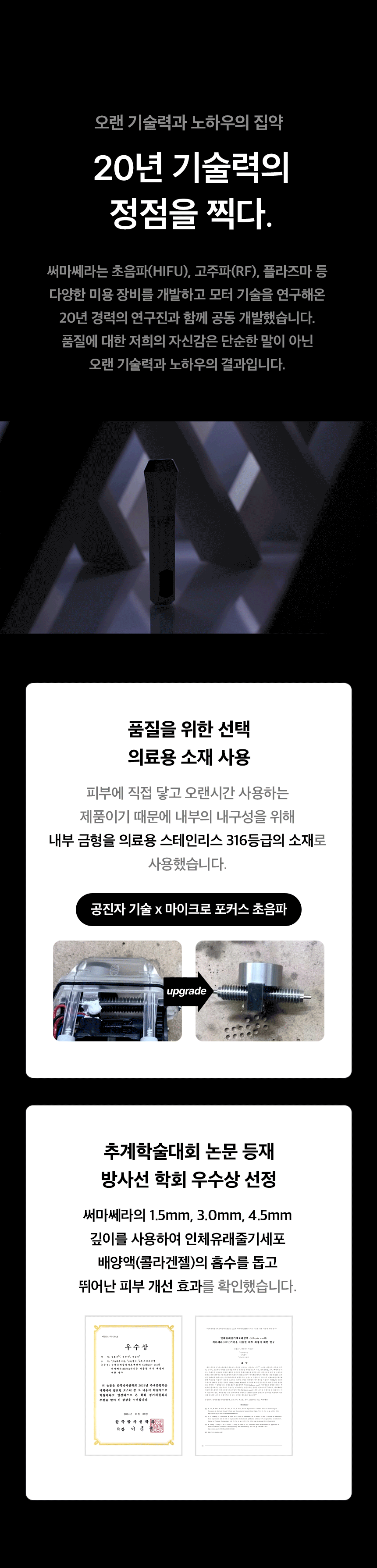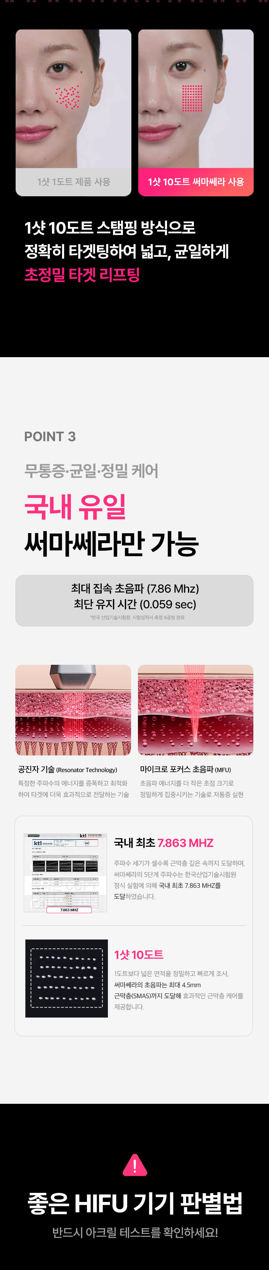 앵콜펀딩에 참여하실 서포터님들께 미리 말씀 드립니다. 1차펀딩에 많은 서포터님들께서 문의를 주셨었는데요, 통증만 있고 아크릴판에 열점을 생성하지 못하는 제품이 너무 많습니다. 1.5mm/3.0mm/4.5mm 까지 통증없이 피부속으로만 초음파에너지를 전달해내는 것이 '써마쎄라의 핵심'입니다. 제품을 받아보신 다음 초음파젤로 테스트 먼저 해보세요. 젤이 톡톡 튄다면 문제 없는 것이예요!