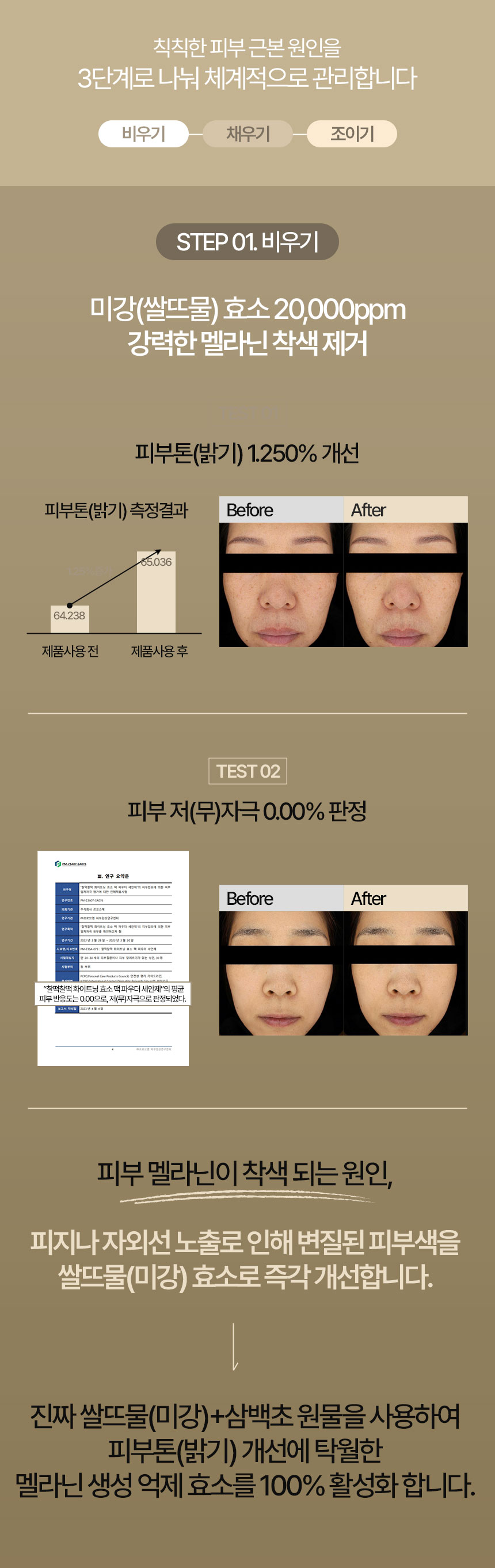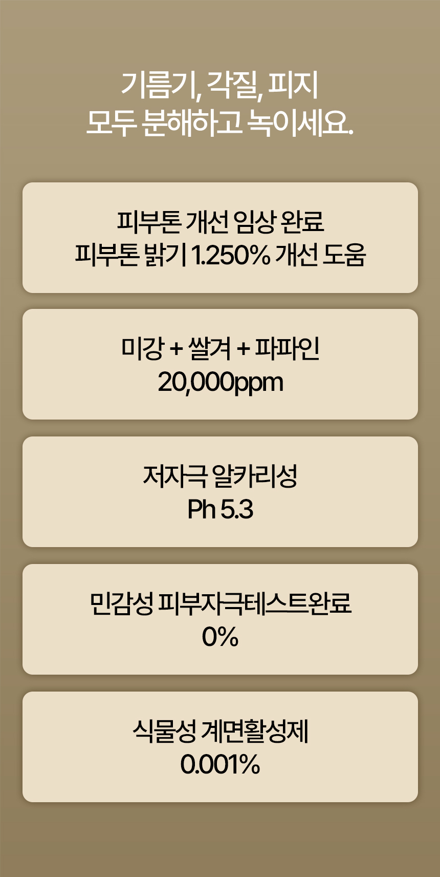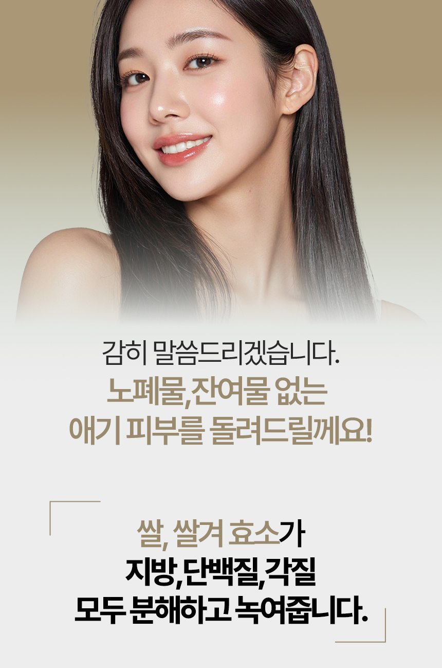 쌀뜨물과 쌀겨 추출물에서 나온 효소를 배합해 피부톤 케어로 깐달걀 피부로 가꾸어 줍니다.