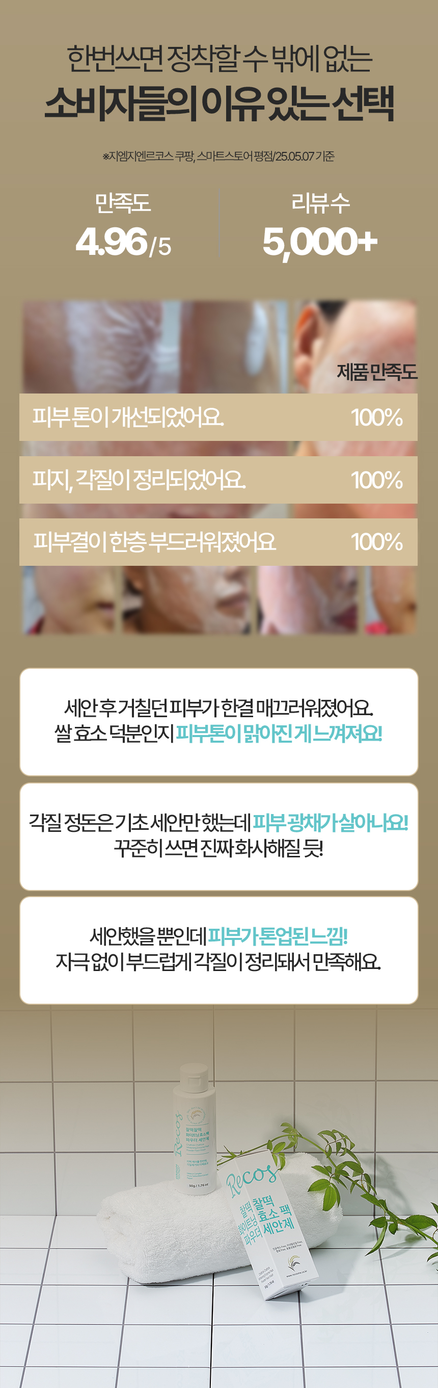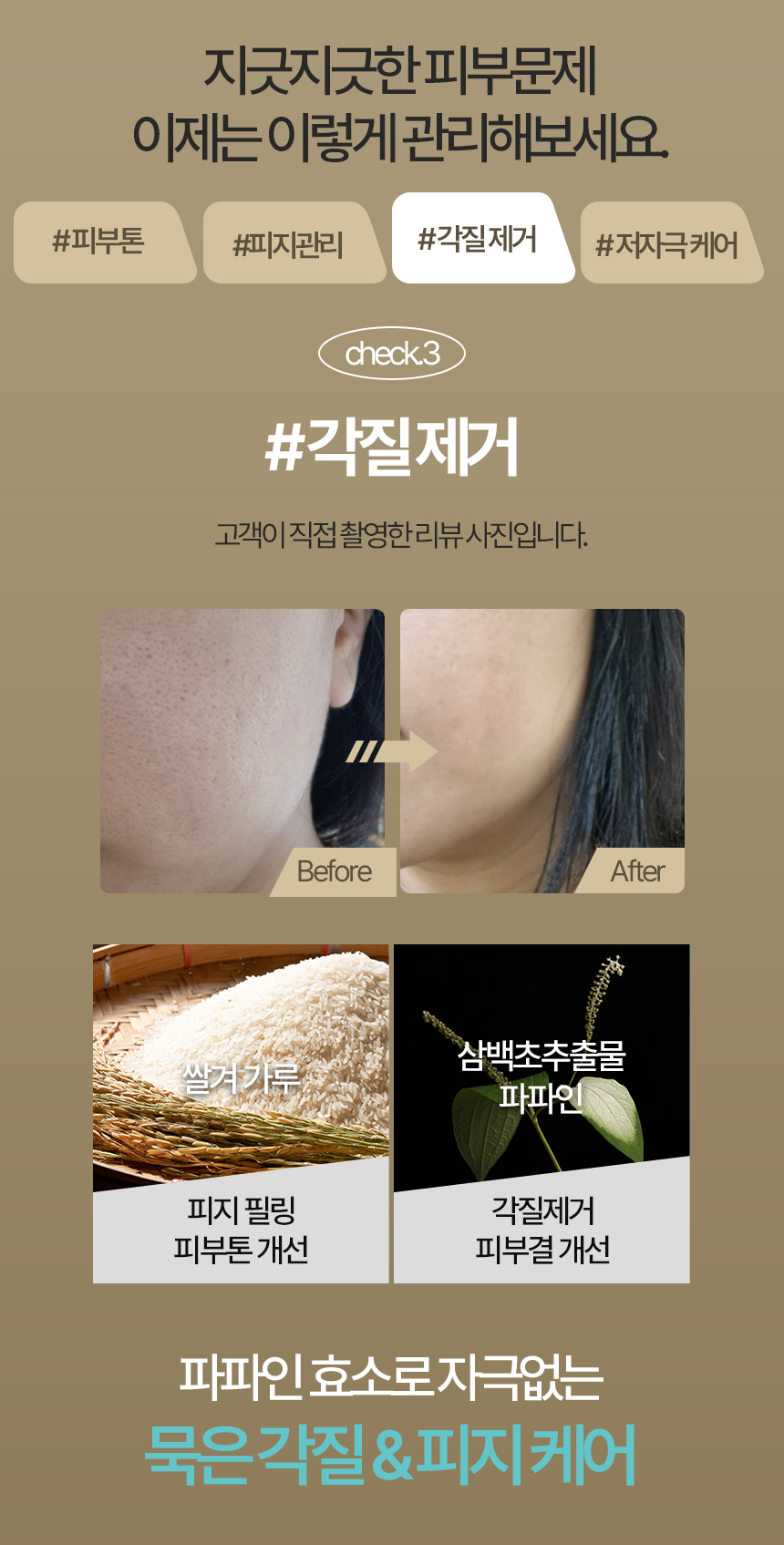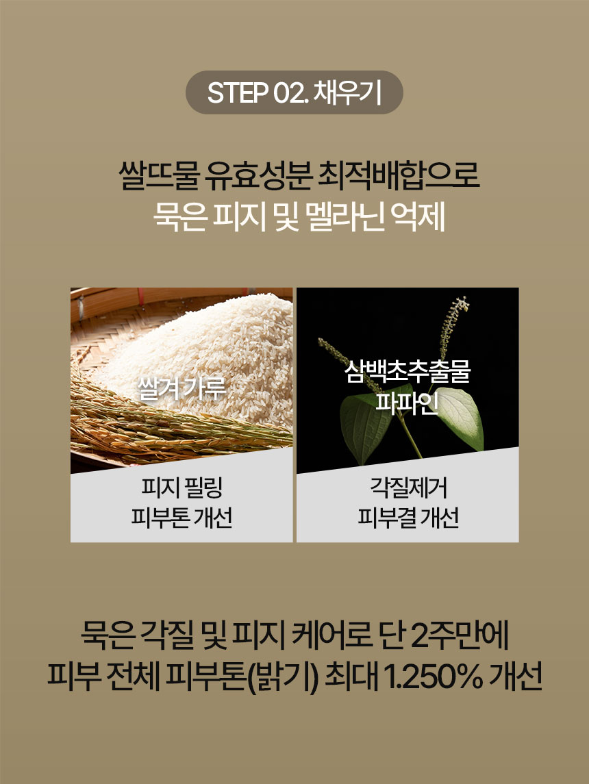 쌀뜨물과 쌀겨 추출물에서 나온 효소를 배합해 피부톤 케어로 깐달걀 피부로 가꾸어 줍니다.