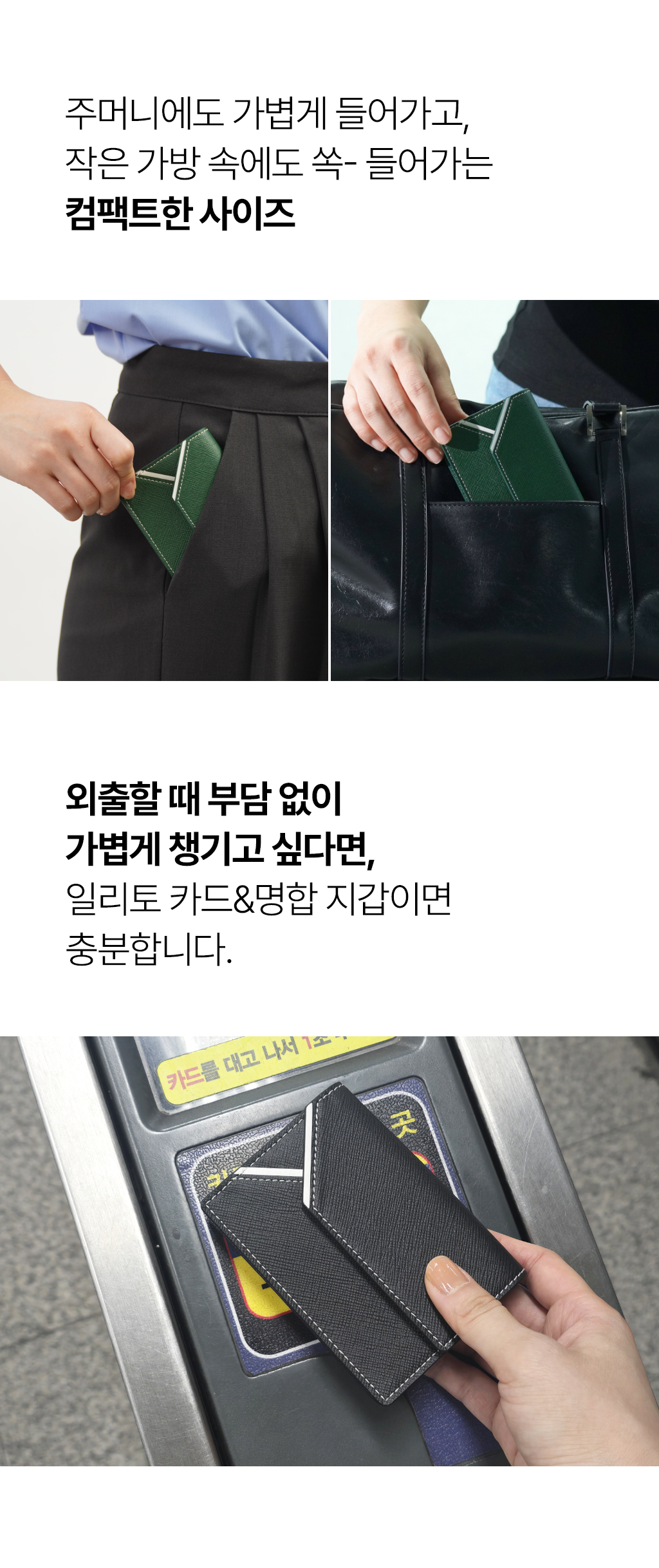 자주 쓰는 카드나 간단한 지폐도 함께 수납할 수 있도록 실용성과 미니멀함을 동시에 고려한 설계로 제작했습니다.