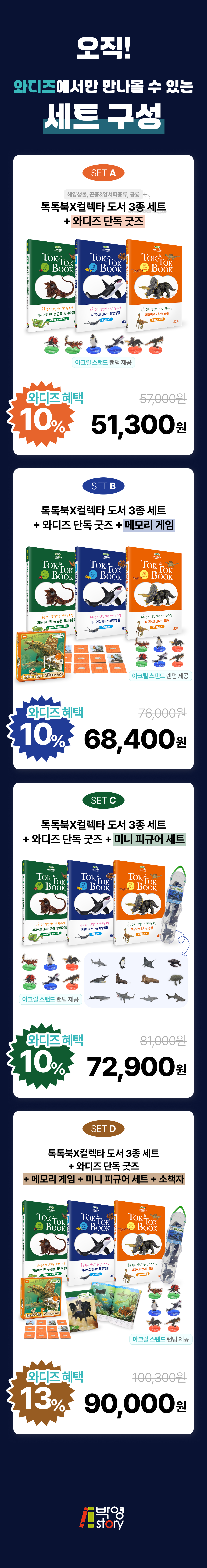 특히 [톡톡북 X 컬렉타] 시리즈는 체험형 생태도감으로, 아이들이 좋아하는 세계적인 피규어 브랜드 컬렉타와 함께 아이들이 만지고 상상할 수 있도록 기획하였으며 정보전달은 물론 색칠하며 톡톡 배경을 뜯어서 자기만의 책을 만드는 재미를 선사하는 체험형 도서입니다.