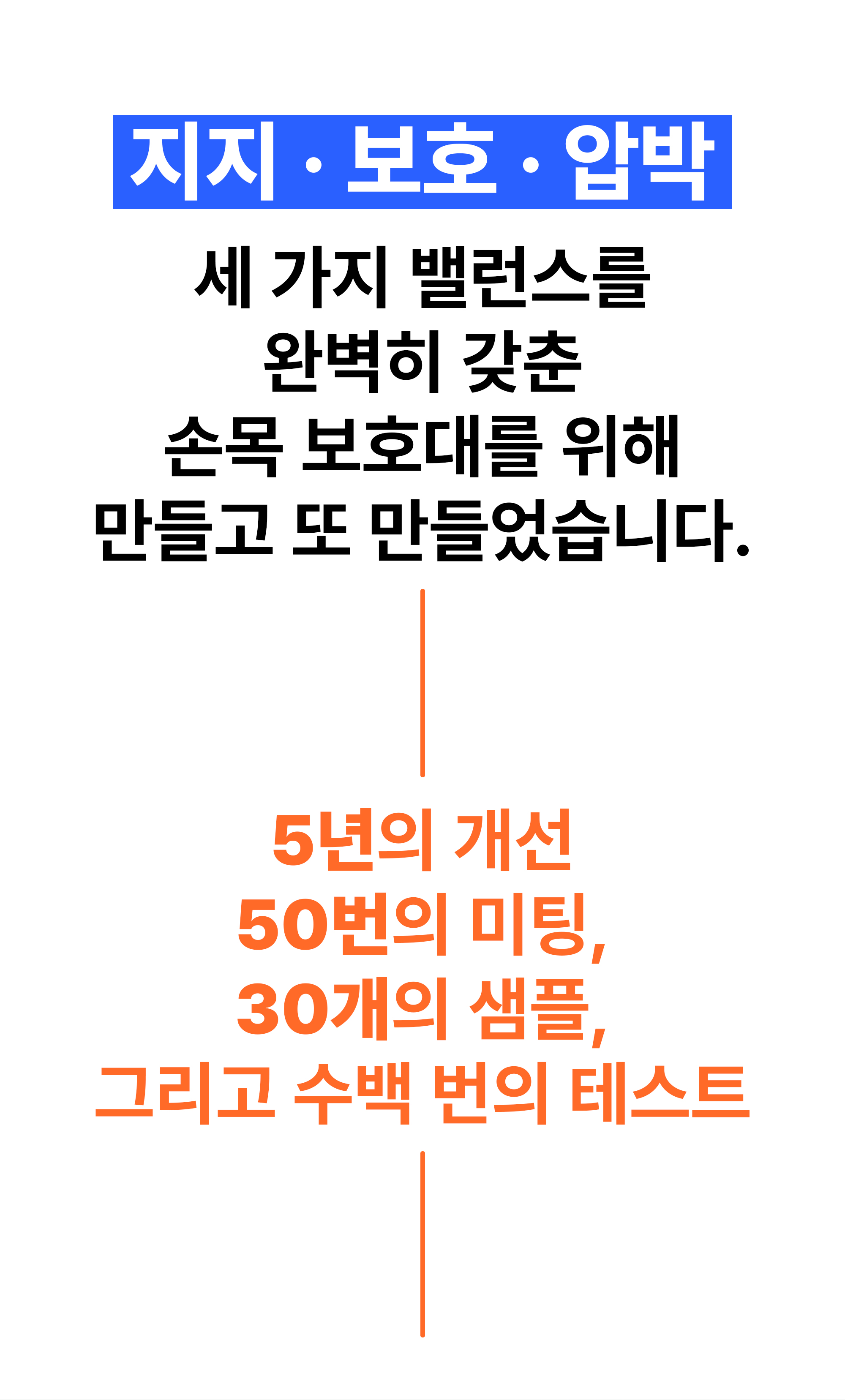 이번 펀딩은 단순한 재출시가 아닙니다. 그동안 받아온 수많은 후기와 피드백을 토대로 2년간의 연구와 개선 끝에 완성된 새로운 손목 보호대입니다.