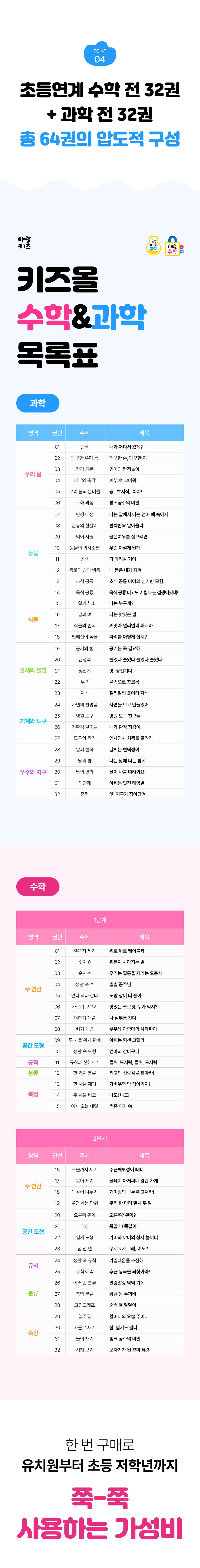 4세부터 7세까지 유아를 위한 전문 도서를 출간하며, 자연, 과학, 문화 등 다양한 주제를 아우르는 전집 시리즈로 많은 사랑을 받고 있습니다. 아이들의 호기심을 자극하는 보드북, 양장본, 플랩북 등 다양한 형식의 책을 통해 흥미롭고 즐거운 독서 경험을 선사합니다.