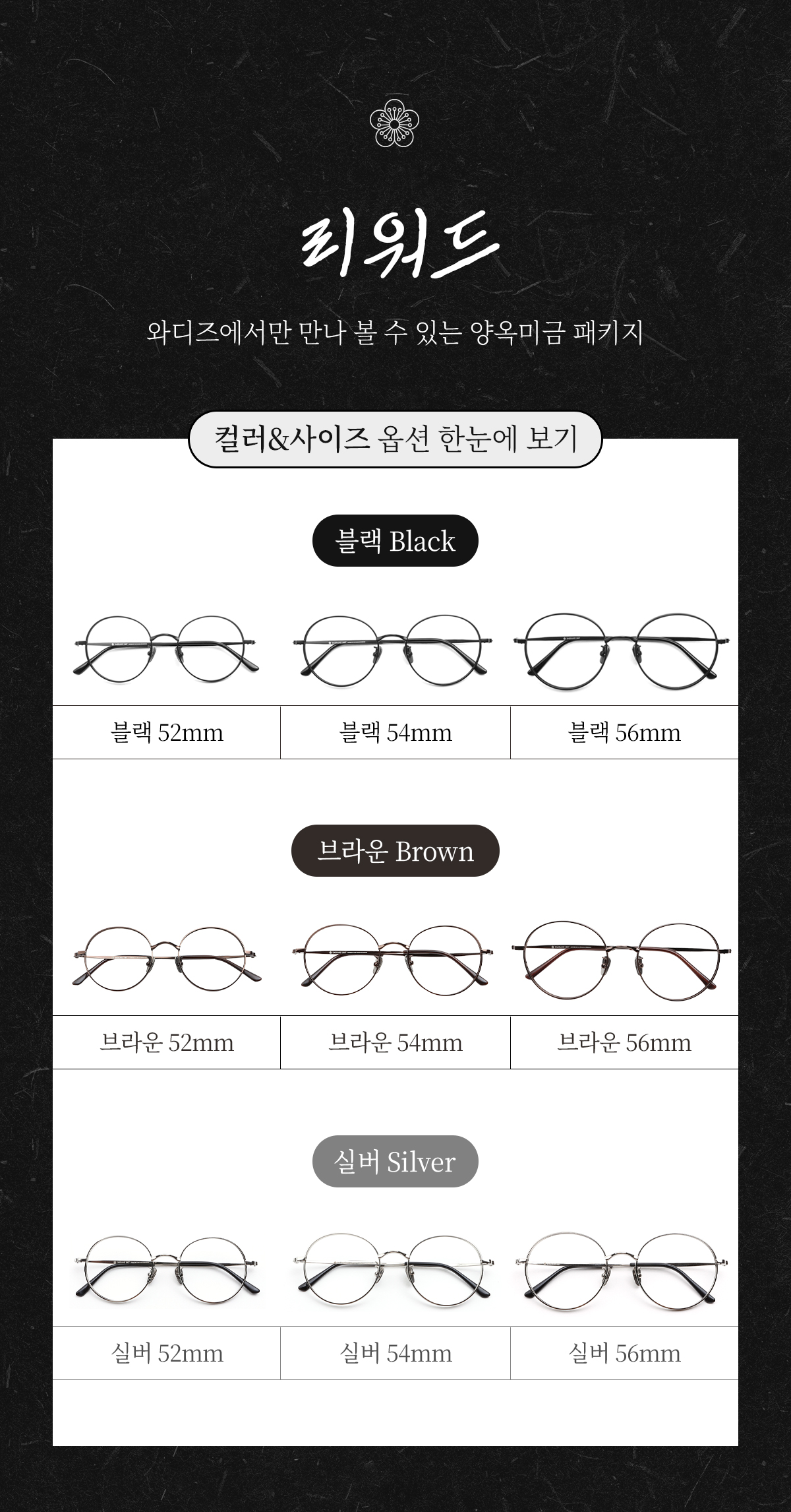 1. 👓 한국의 미를 담은 안경 - 좋은 옥과 아름다운 금의 의미를 담은 고품질 안경 2. 🎯 맞춤형 3가지 사이즈 제공 - 한국인 얼굴형에 최적화된 52, 54, 56mm 사이즈 3. 🎁 와디즈 단독 패키지 - 3가지 컬러와 사이즈 옵션을 합리적 가격에 제공