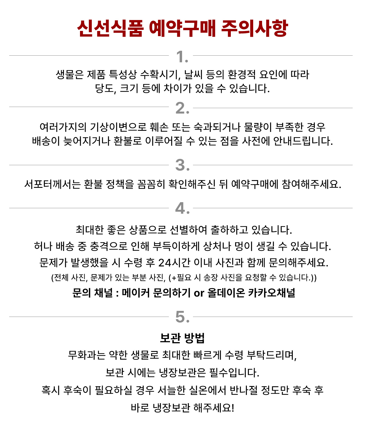 - 혹시 수령 후 배송 중 충격으로 인해 과일의 상태가 좋지 않을 경우 즉시 촬영 후 24시간 내 메이커 문의하기로 문의해주시면 문의 순서대로 답변드리겠습니다. (전체사진, 문제가 있는 부분 사진, (+필요 시 송장 사진))