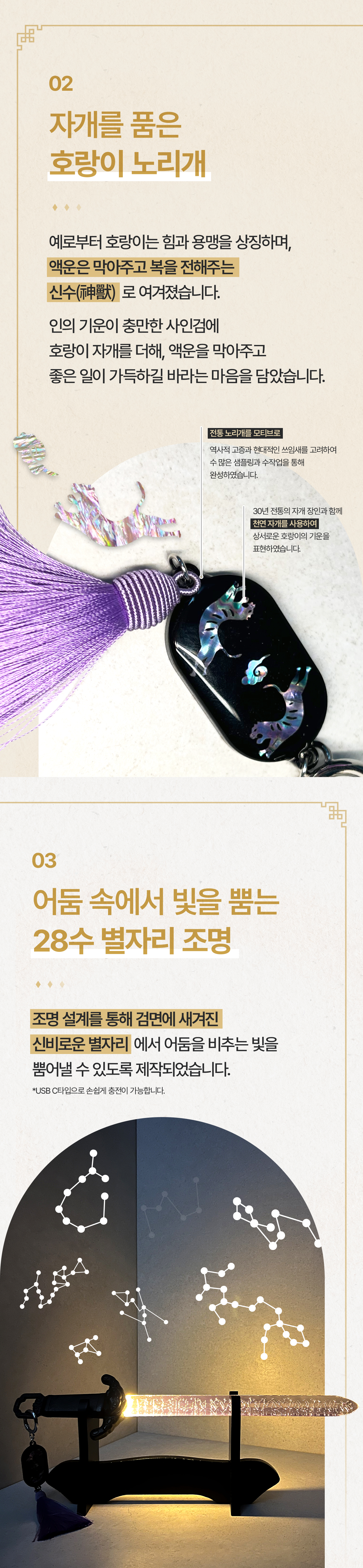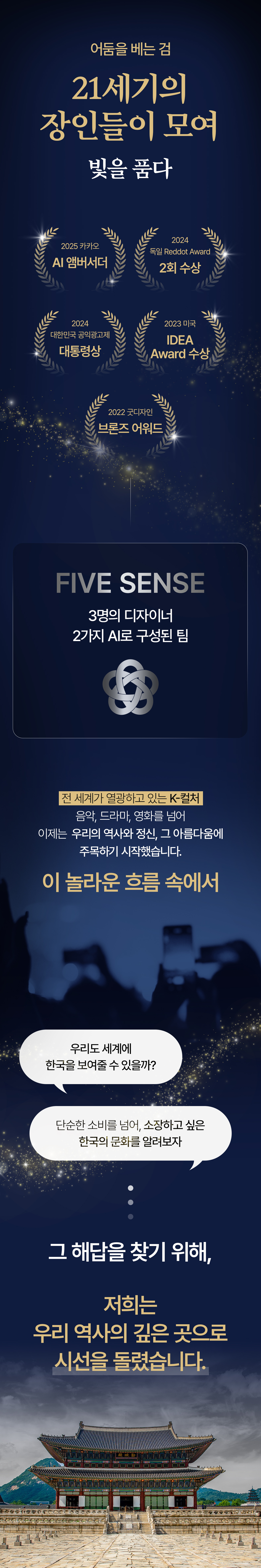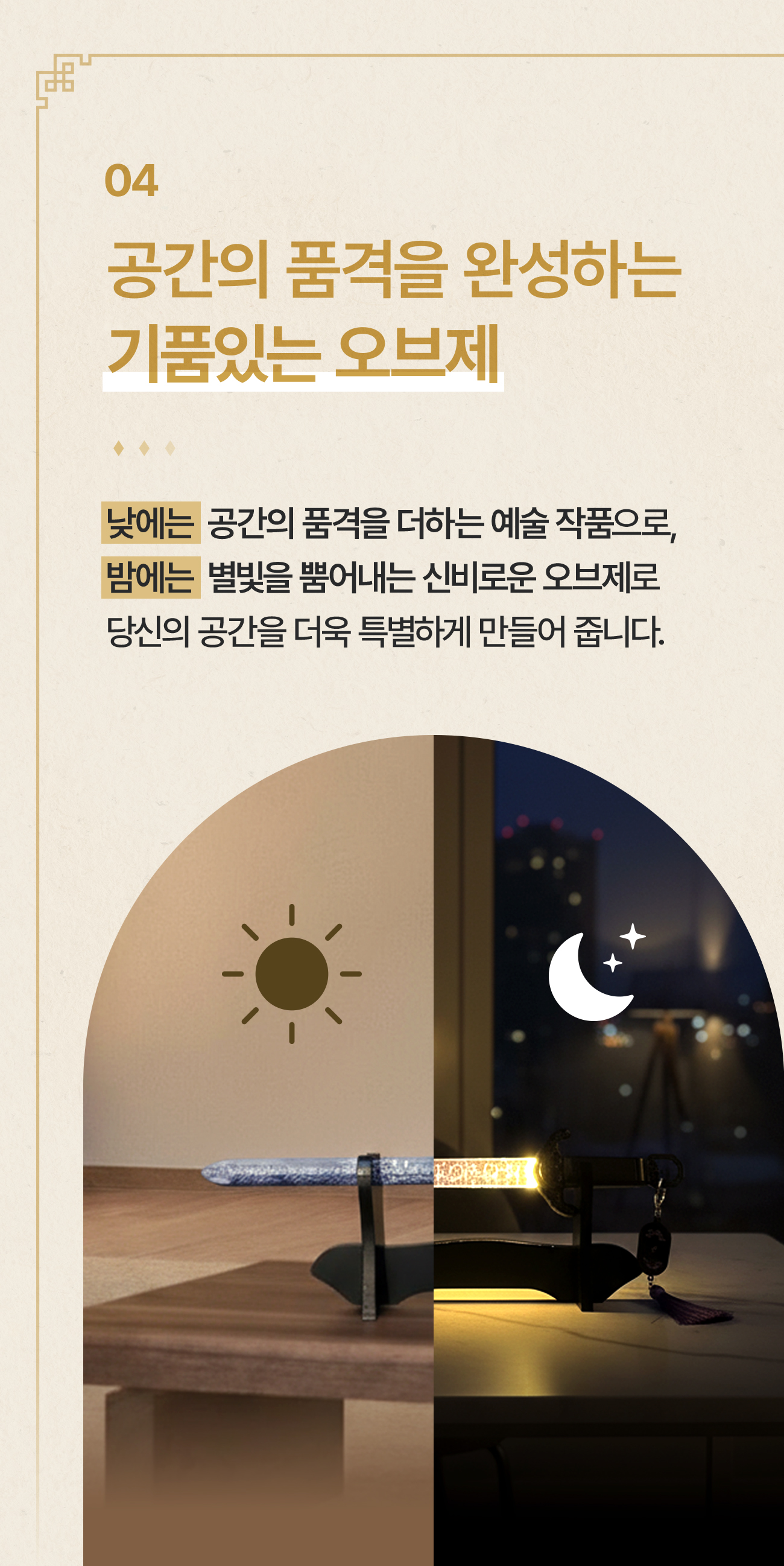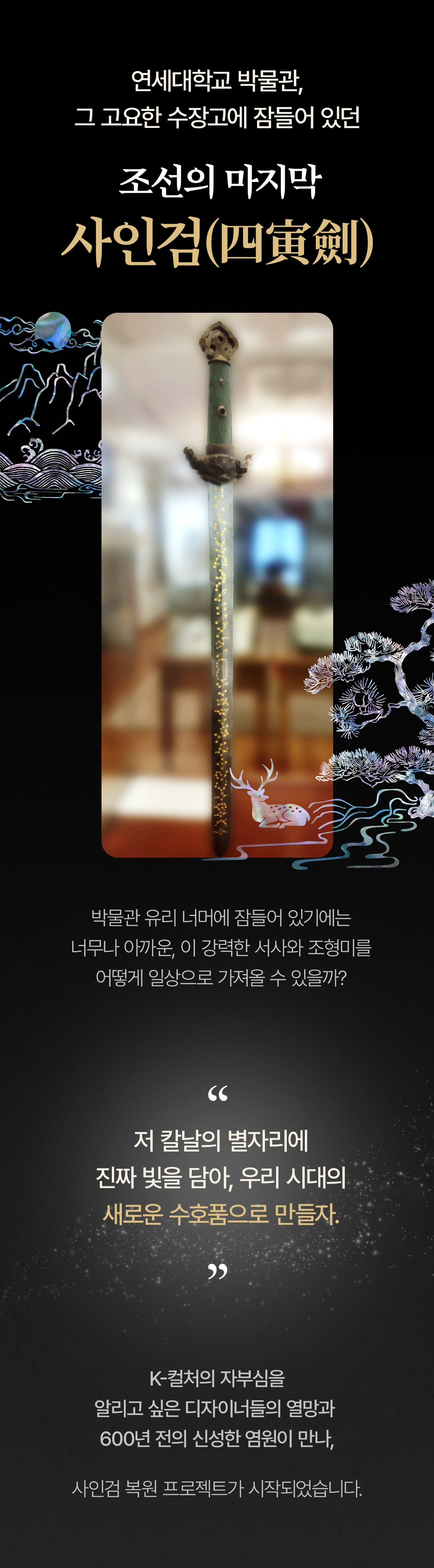 - 이러한 흐름 속에서 사인검의 상징성과 아름다운 형태를 현대적인 조명·인테리어 소품으로 재해석하여, 일상 공간에서도 한국 전통문화의 의미와 K-컬처의 즐거움을 함께 느낄 수 있는 제품을 만들고자 펀딩을 진행합니다.