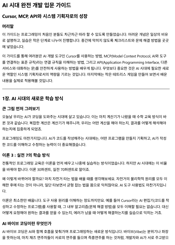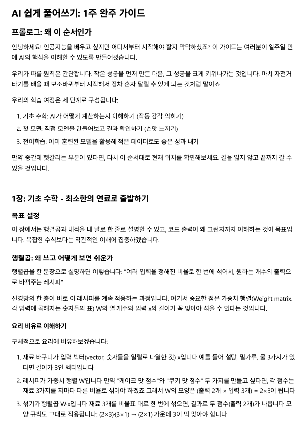 ✔️ 1권: AI 기초 완전 정복 & 프롬프트 마스터 과정 (100페이지) - 웹사이트 제작, 모바일 앱 개발, 자동화 시스템 구축, 콘텐츠 생성 등 실제로 돈이 되는 프로젝트들을 A부터 Z까지 완성해봅니다. 이 1권만으로도 AI 활용 능력이 상위 10%에 진입할 수 있습니다.
