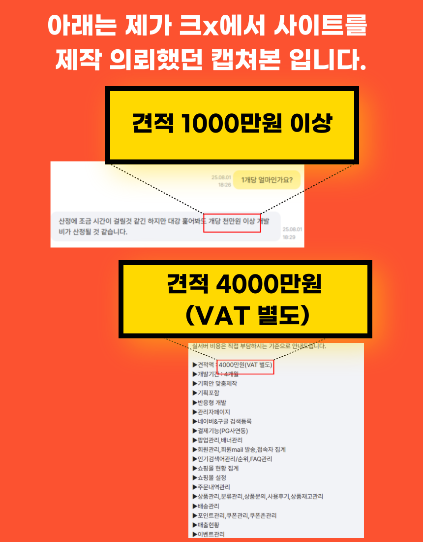 ✔️ 개발 외주를 맡겼을 경우의 비용 - 간단한 웹사이트 하나만 제작해도 최소 500만원에서 시작합니다. 기능이 조금만 복잡해져도 1,000만원을 훌쩍 넘어가죠.
