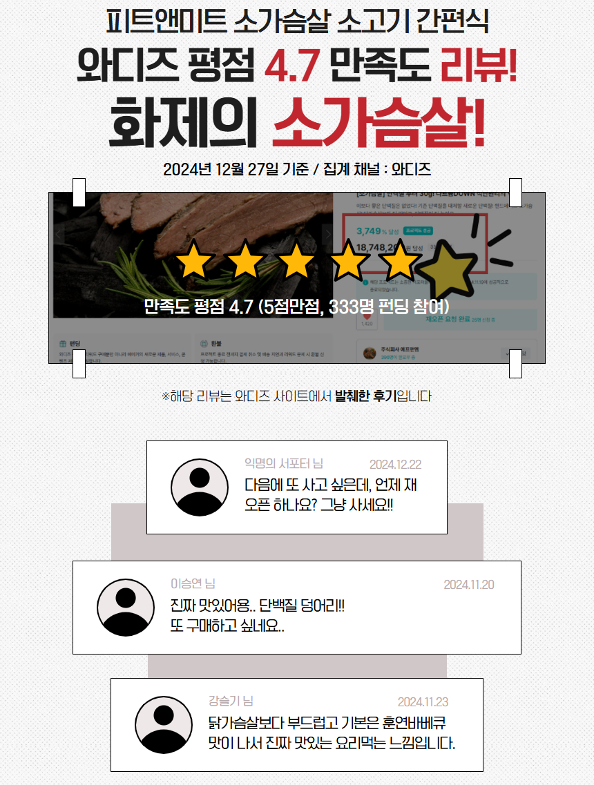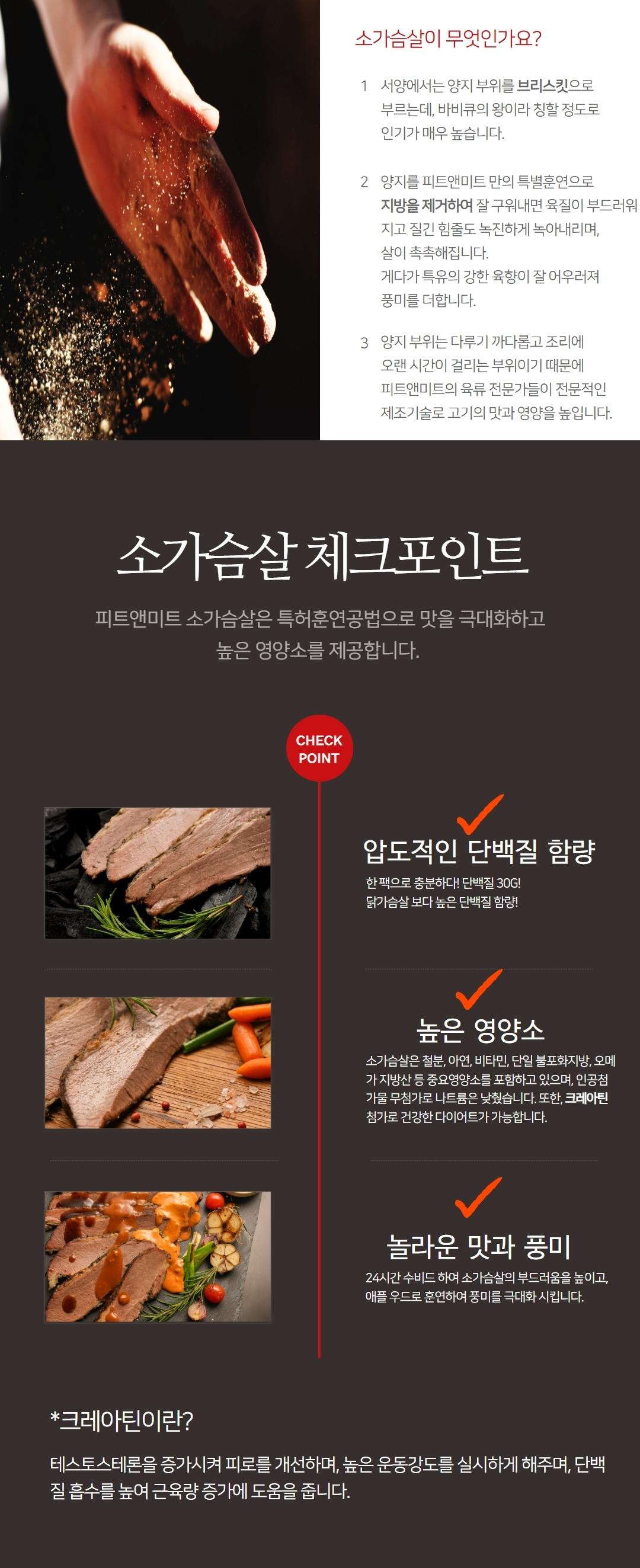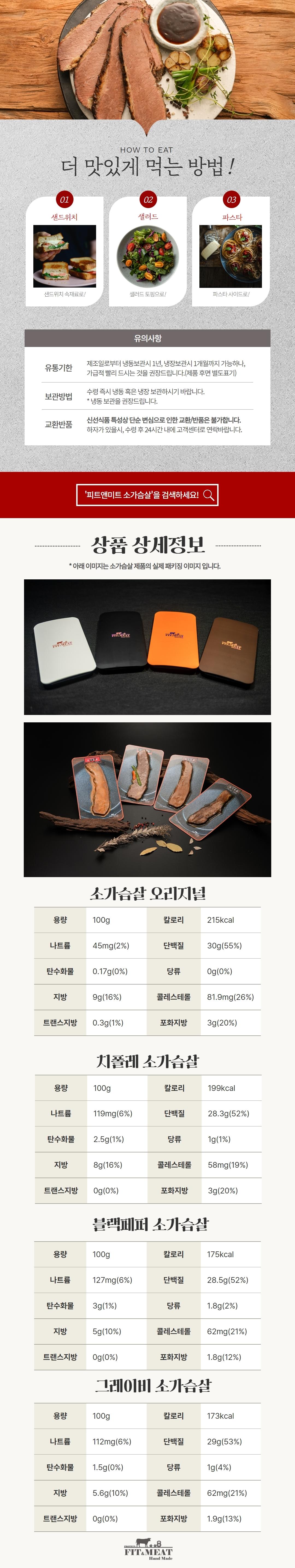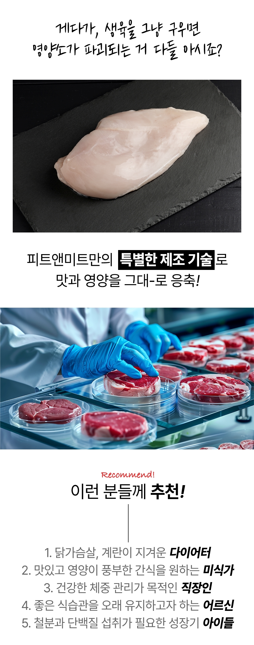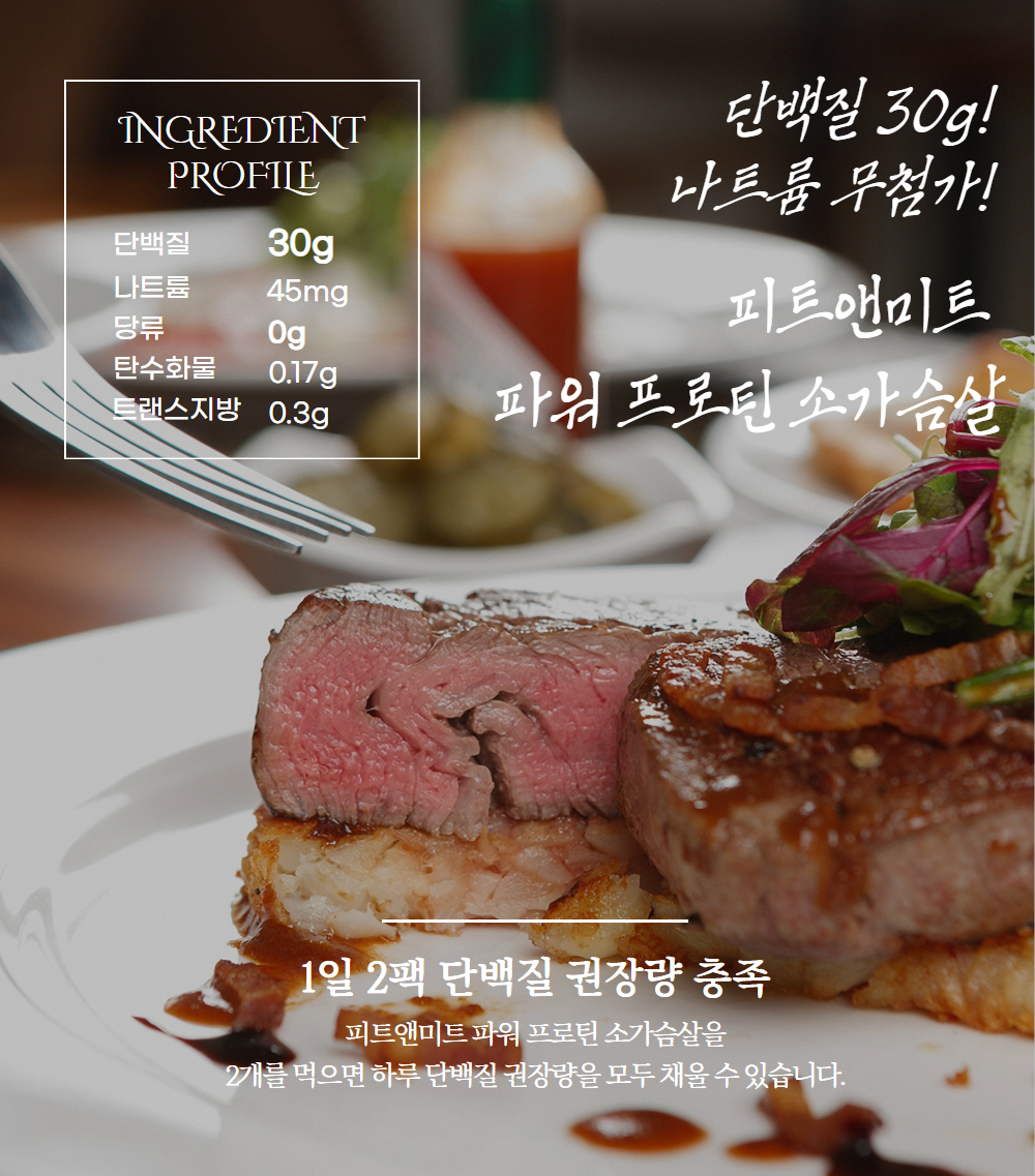 높은 단백질 함유량, 다양한 영양소, 낮은 칼로리와 나트륨을 보유하고 있는 피트앤미트 소가슴살은 닭가슴살이나 연어, 계란에 질리신 분들들에게 맛있고 건강한 식단을 제공합니다.