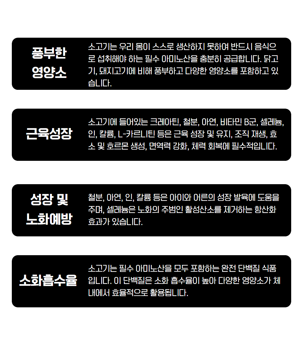 | 운동&근육성장 | 크레아틴(근력향상,운동능력 증가), 카르니틴(지방대사 촉진, 피로회복) 철분,아연 풍부 |