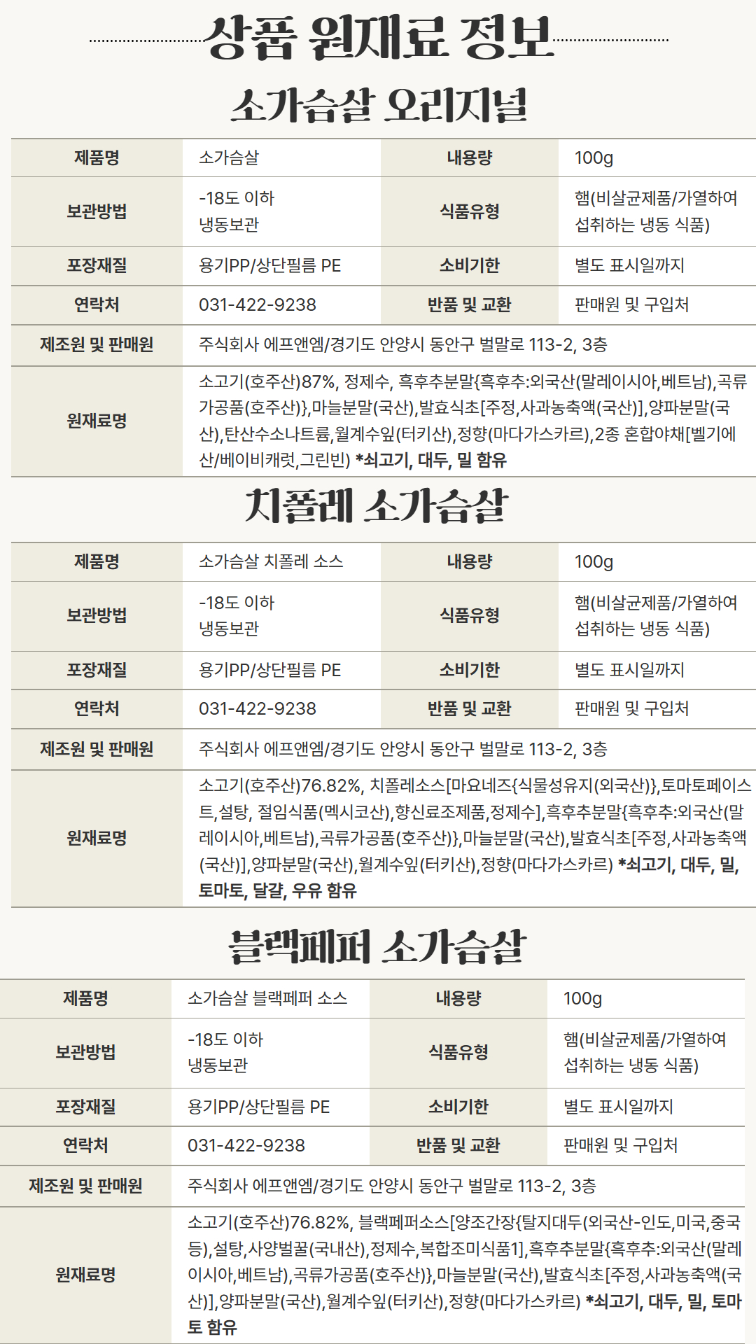 | 구분 | 소가슴살(100g당) | 닭고기(100g당) |