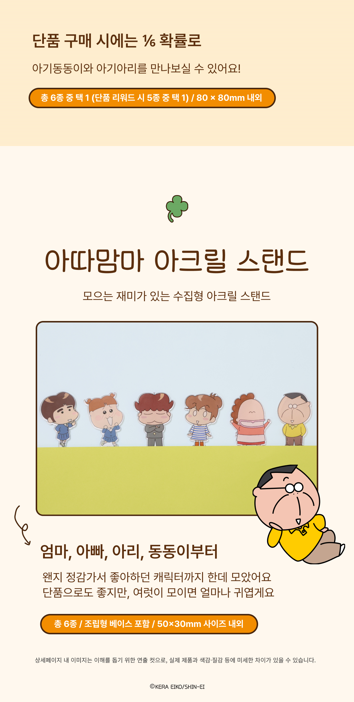 Q3. 아크릴 스탠드 여러 개를 조립하면 이어지나요?A. 각각의 캐릭터 스탠드는 독립형 구조로 끼울 수 있는 받침을 함께 드립니다. 아크릴 스탠드 풀패키지를 구매하시는 경우에는 함께 진열하면 애니메이션 한 장면처럼 자연스럽게 어우러지도록 배경 디오라마를 포함하여 6종을 한 번에 끼울 수 있는 별도 받침까지 제공됩니다.