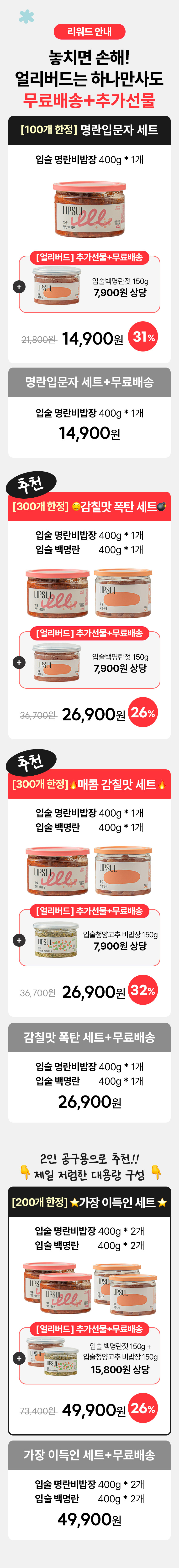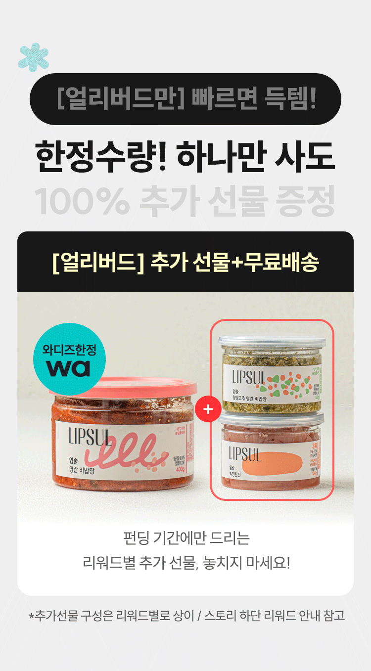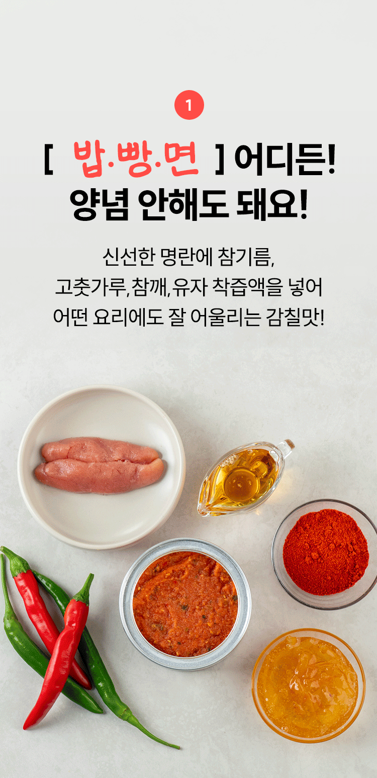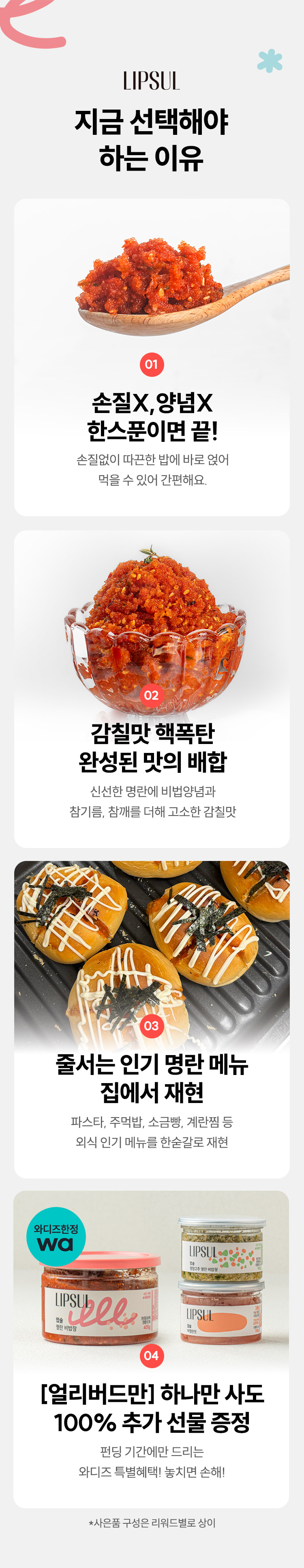 1. 🍝 명란 소스 간편 요리 - 한 숟갈로 명란파스타, 소금빵 등 다양한 요리 완성 2. ⏱️ 요리 시간 단축 - 요리 1도 몰라도 1/10 시간에 맛은 10배 이상 향상 3. 🎁 얼리버드 혜택 - 한정 수량 구매 시 100% 추가 선물과 무료배송 제공