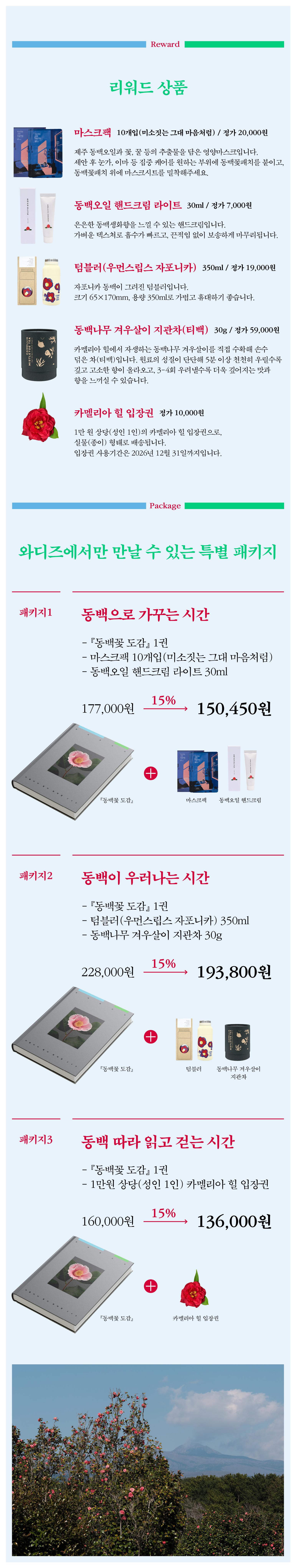 제주라는 ‘지역’과 겨울이라는 ‘계절’에 구애받지 않고, 언제 어디서나 카멜리아 힐의 동백을 가까이 두고 즐길 수 있도록 『동백꽃 도감』을 만들었습니다. 『동백꽃 도감』과 카멜리아 힐의 대표 굿즈로 구성된 이 특별 패키지는 오직 와디즈에서만 만날 수 있습니다.