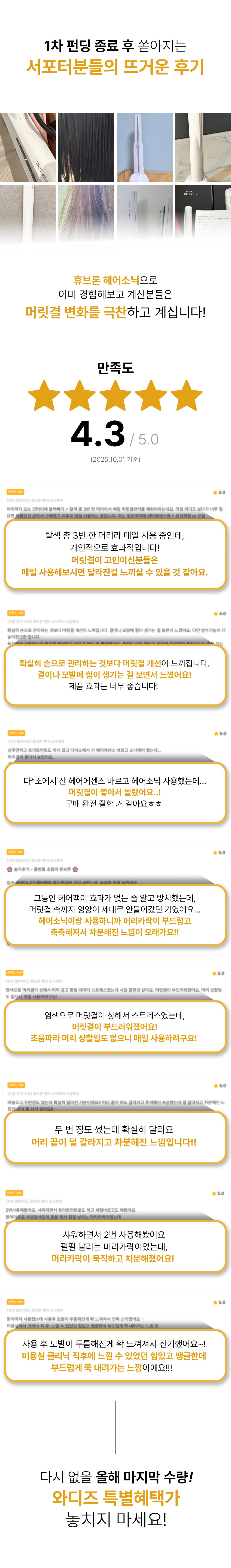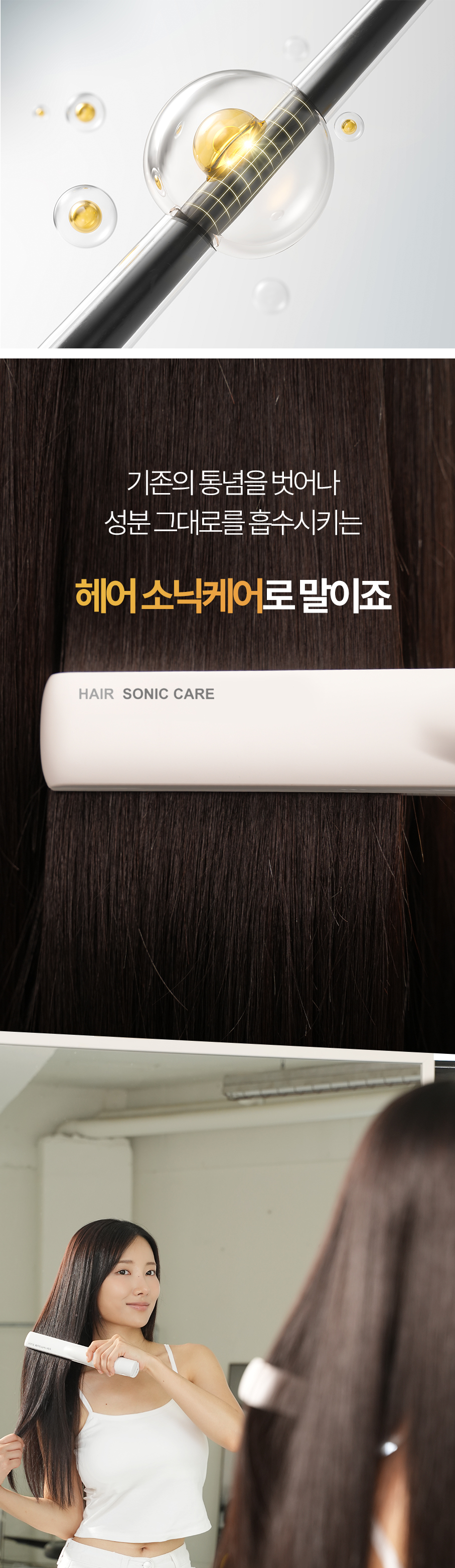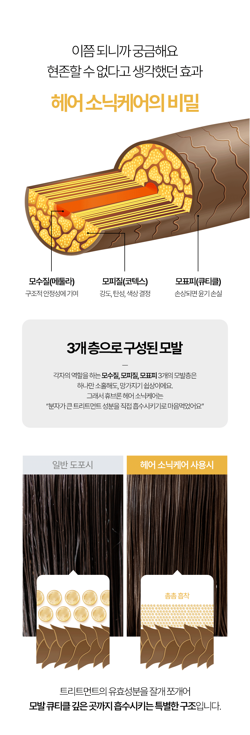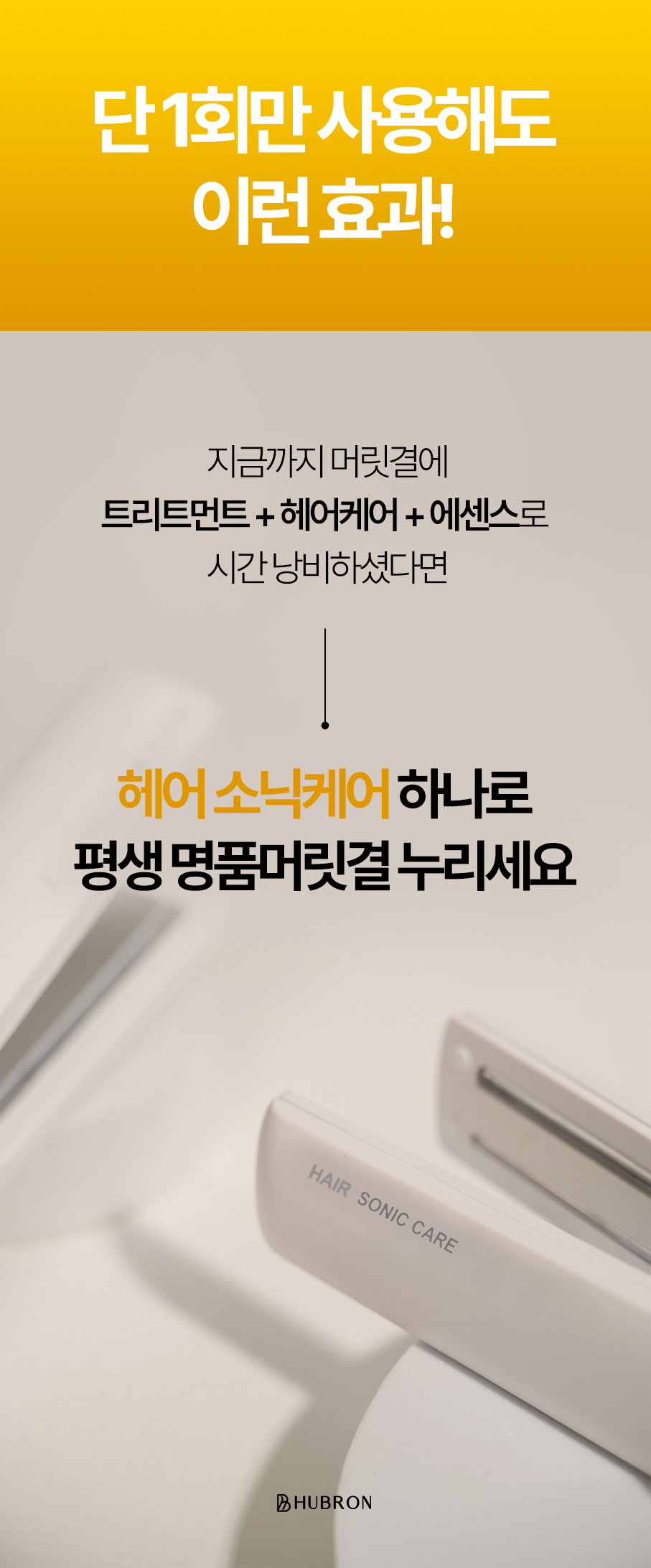 휴브론에서 소개하는 헤어소닉은 일본에서 이슈가 되었던 머릿결 개선을 위한 초음파 디바이스의 효과를 그대로 서포터 여러분에게 소개하기 위해 탄생한 헤어 디바이스입니다.