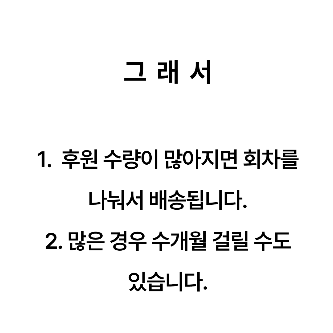 핸드메이드로 하나 하나 제작하기 때문에 예상보다 후원자수가 많을 경우는 회차를 나눠서 발송될 수 있습니다.