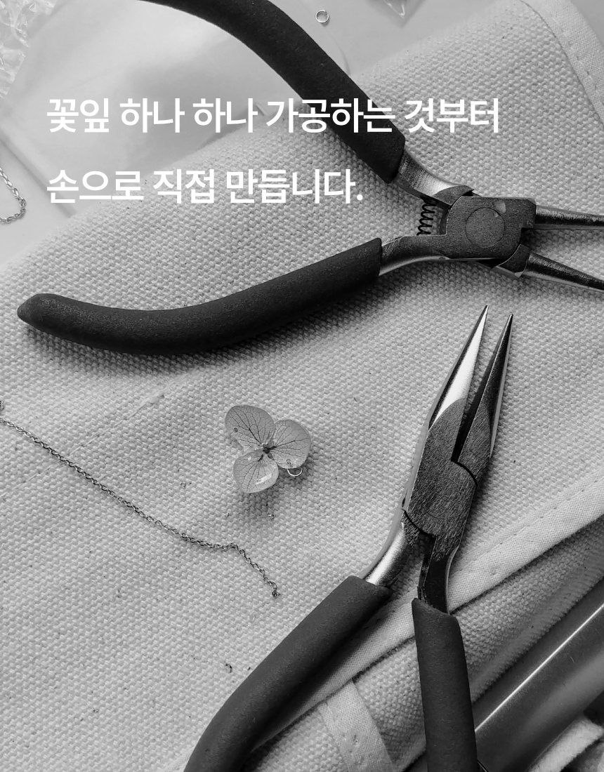 프리저브드플라워는 자연의 꽃이기에 모양과 색깔이 제각각이에요. 꽃시장에 다니며 직접 눈으로 보고 재료를 구입하는 일부터 시작해요. 그리고 중요한 재료 중 하나인 비녀도 퀄리티가 좋은걸로 사용해요.