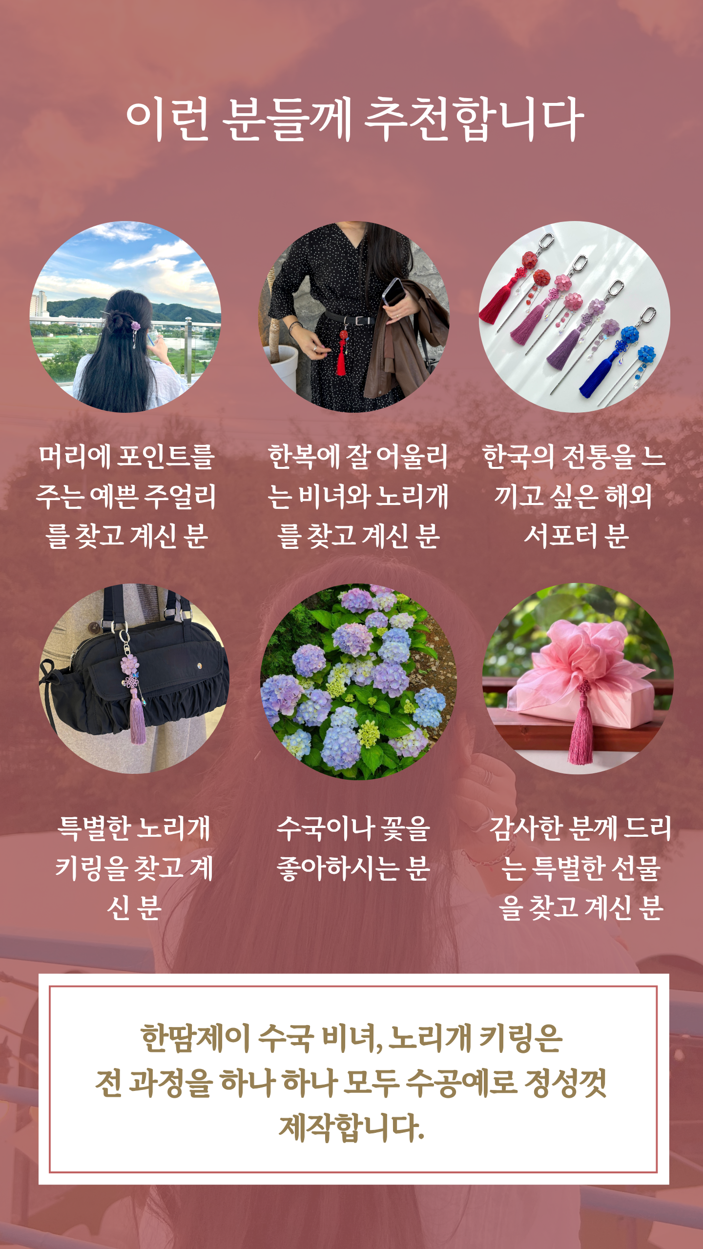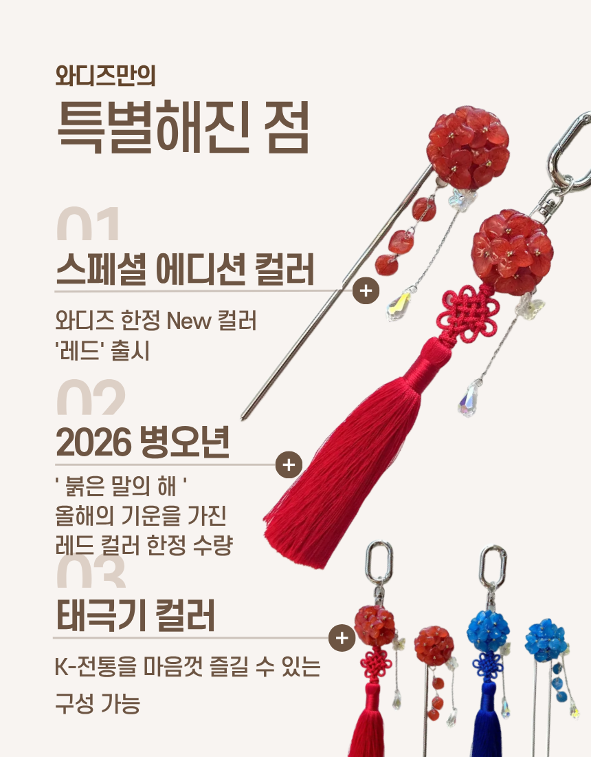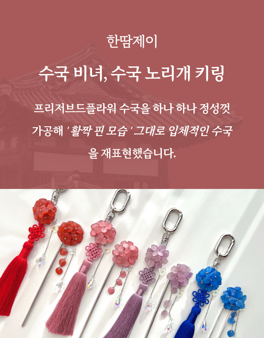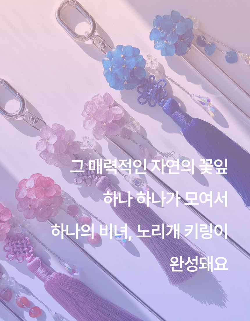 케이팝 데몬 헌터스 대유행으로 K-문화가 큰 관심을 받으면서 노리개도 재조명되었죠. 수국이 노리개와 너무나도 찰떡이라 제작하면서도 반할 수 밖에 없었어요 !