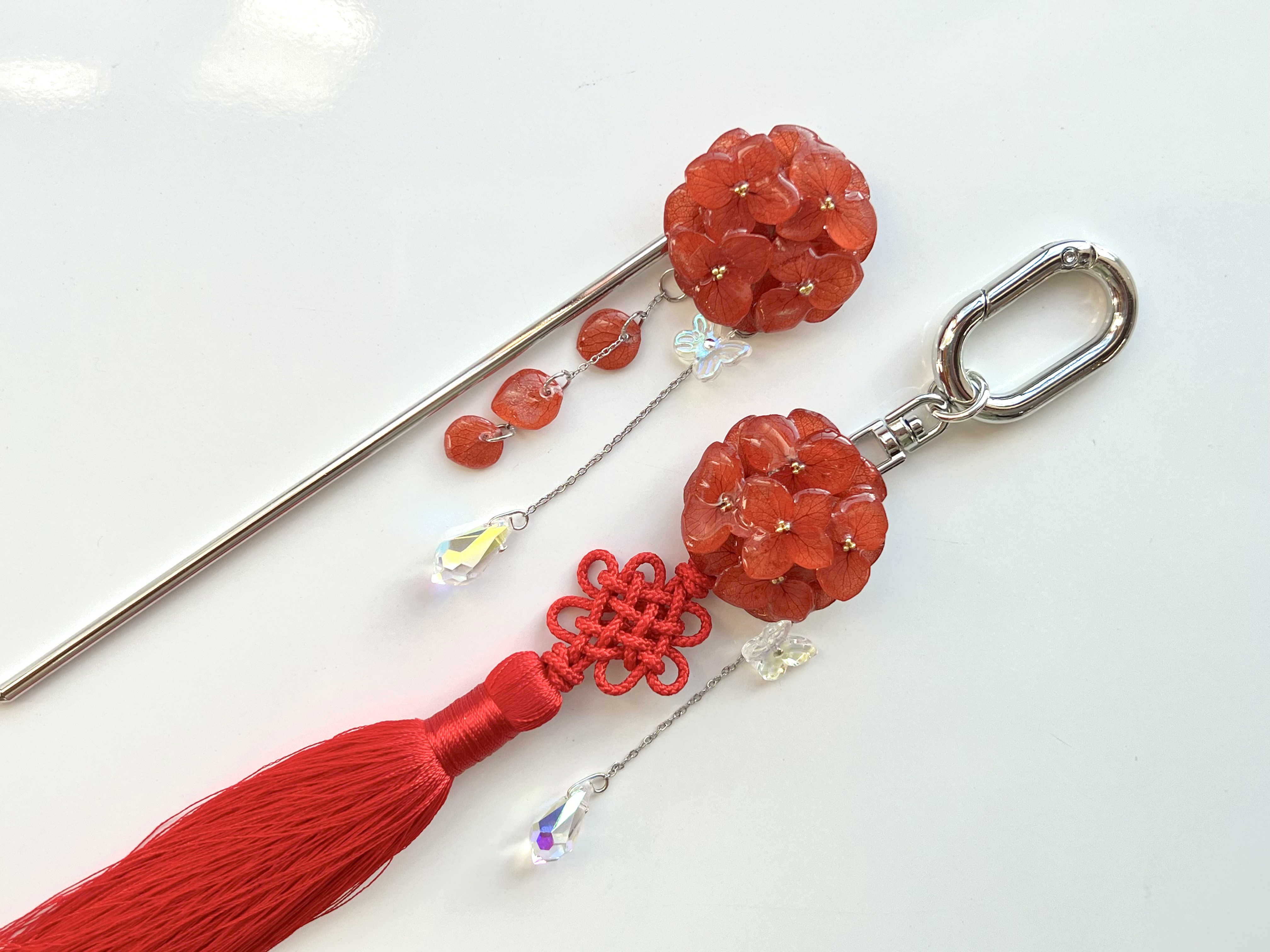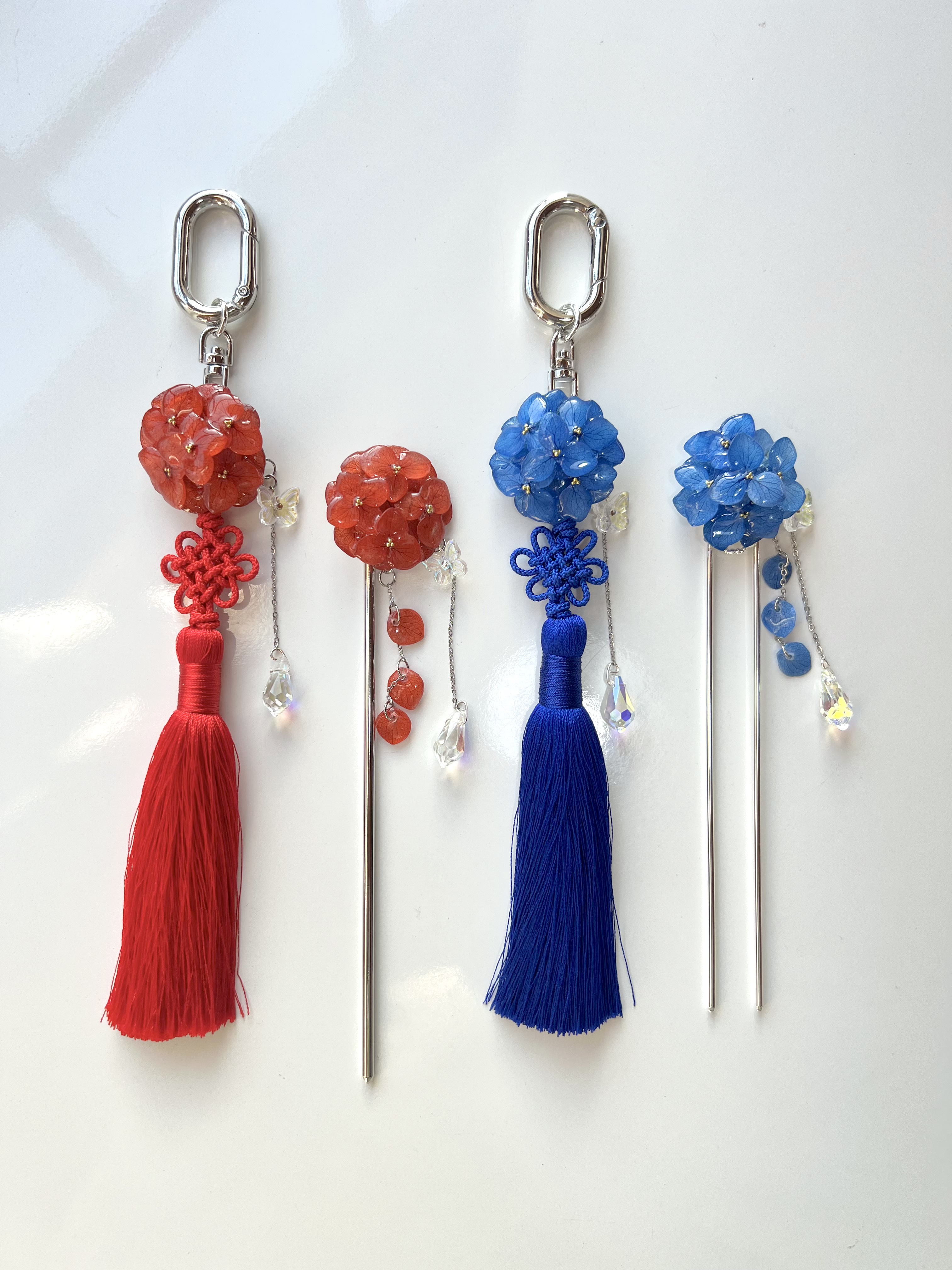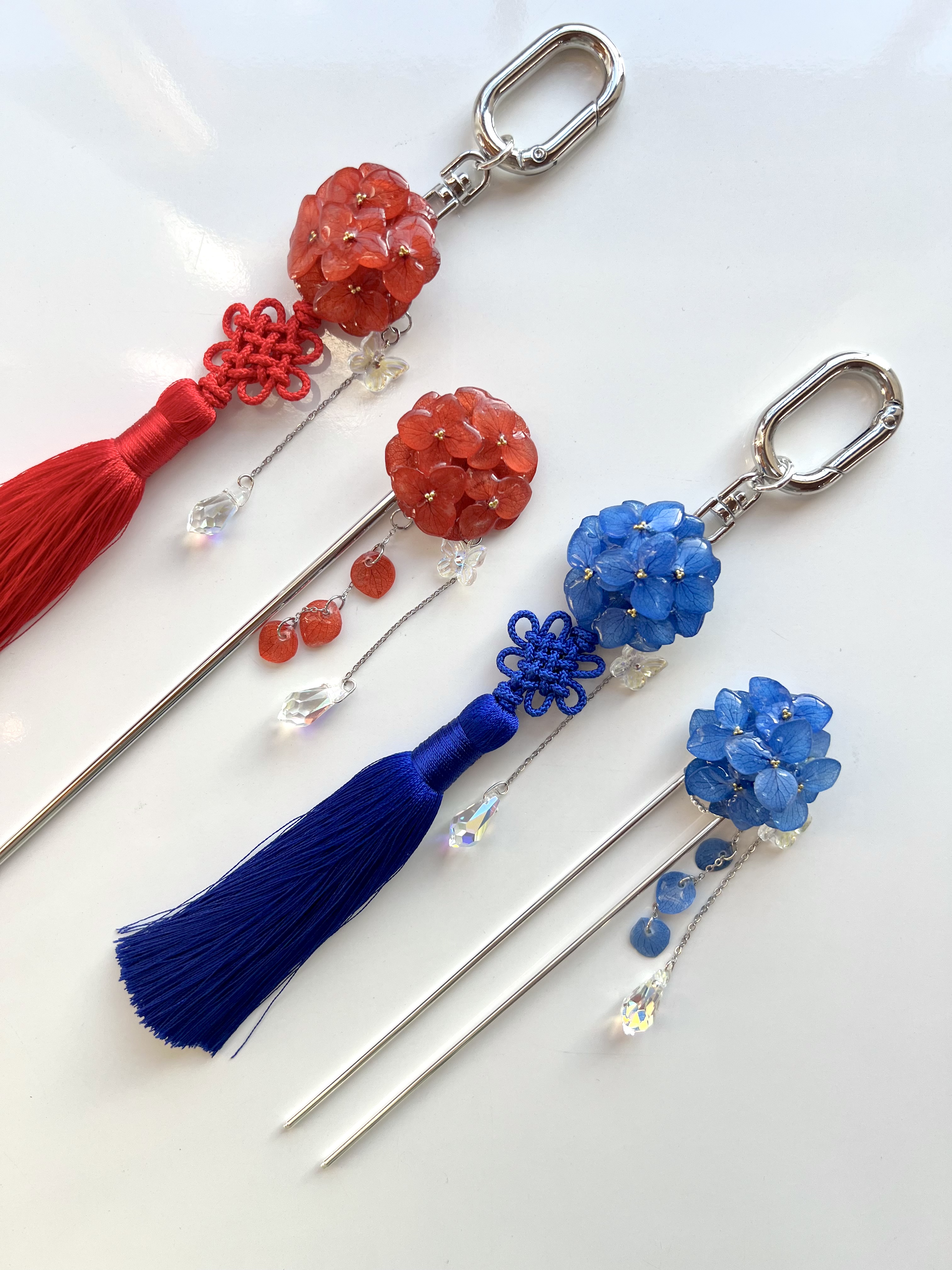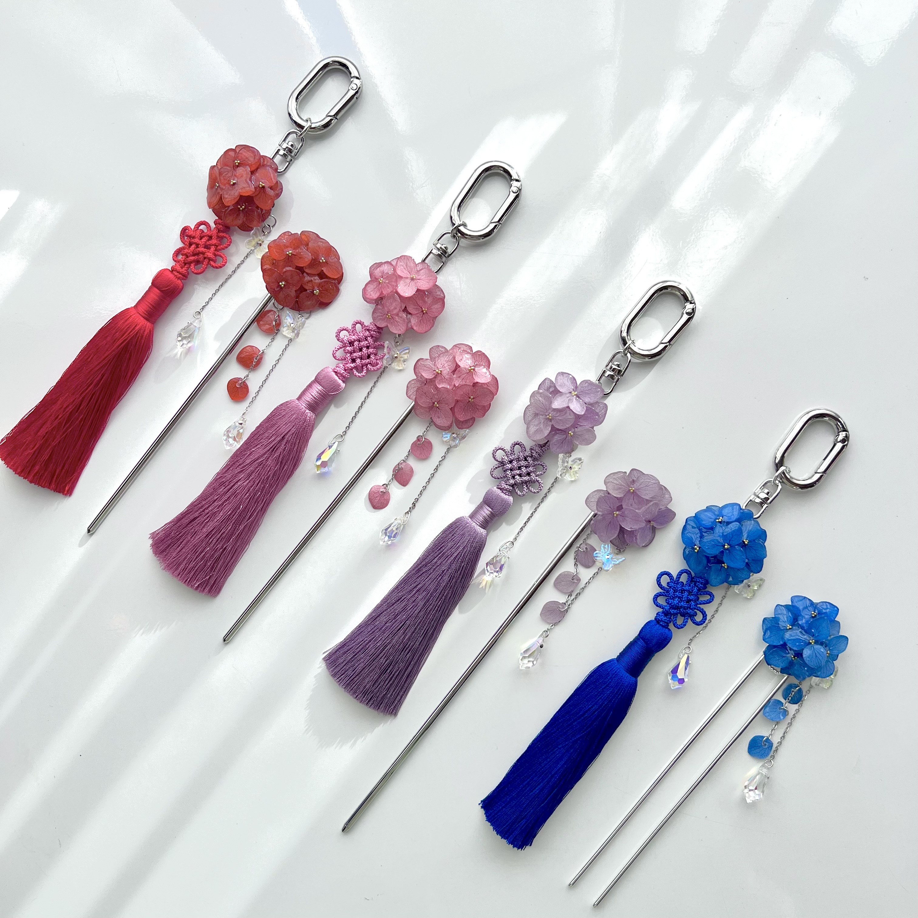왼쪽부터:수국비녀 레드 실버 15cm / 수국비녀 카시스핑크 실버 15cm /