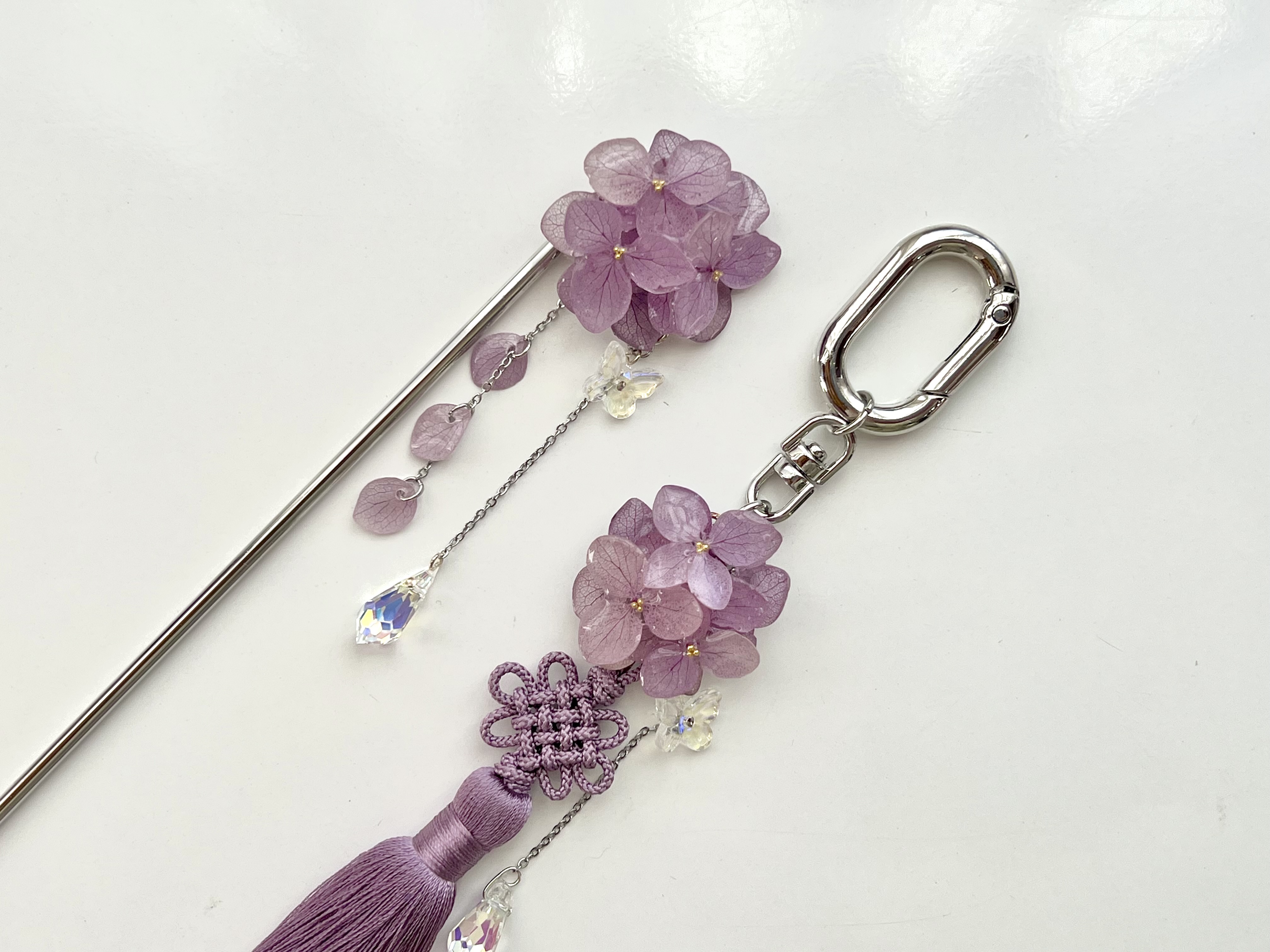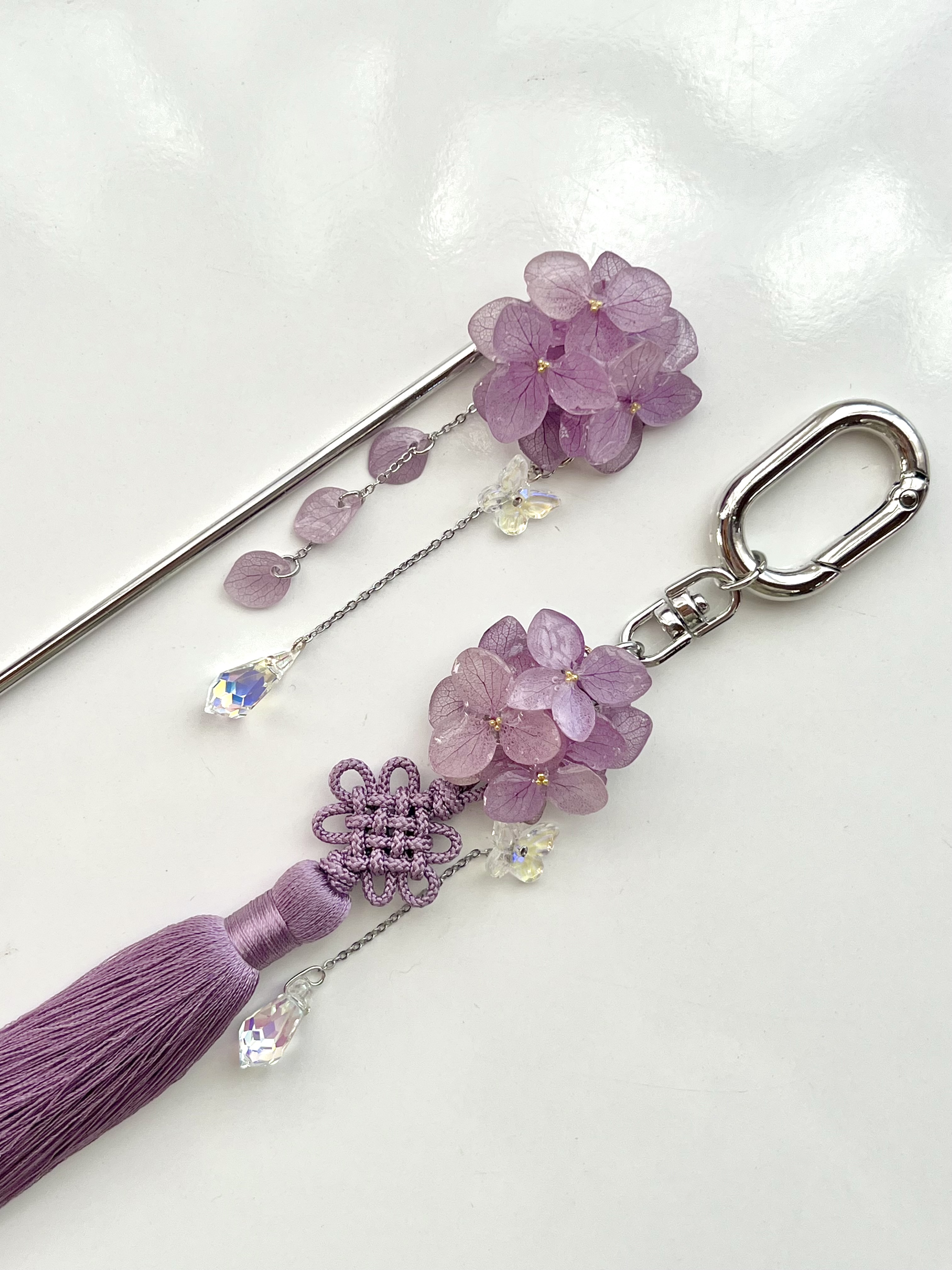 수국 비녀 : 보라 / 실버 15cm, 수국 노리개 키링 : 보라 / 원형 착용