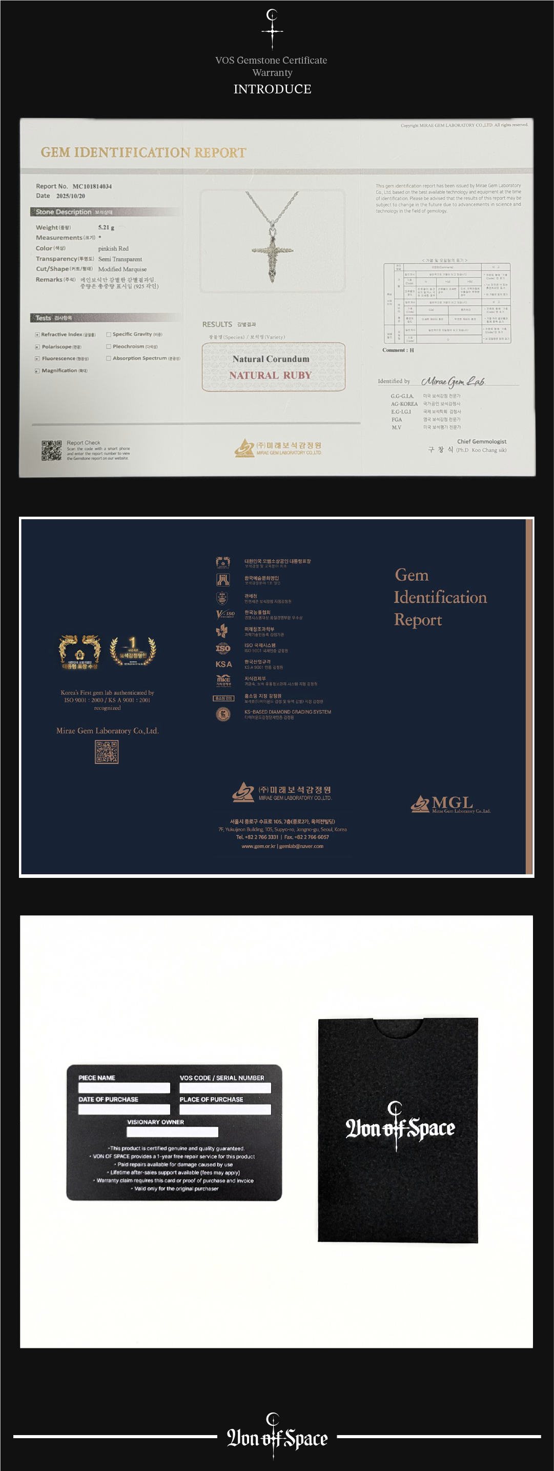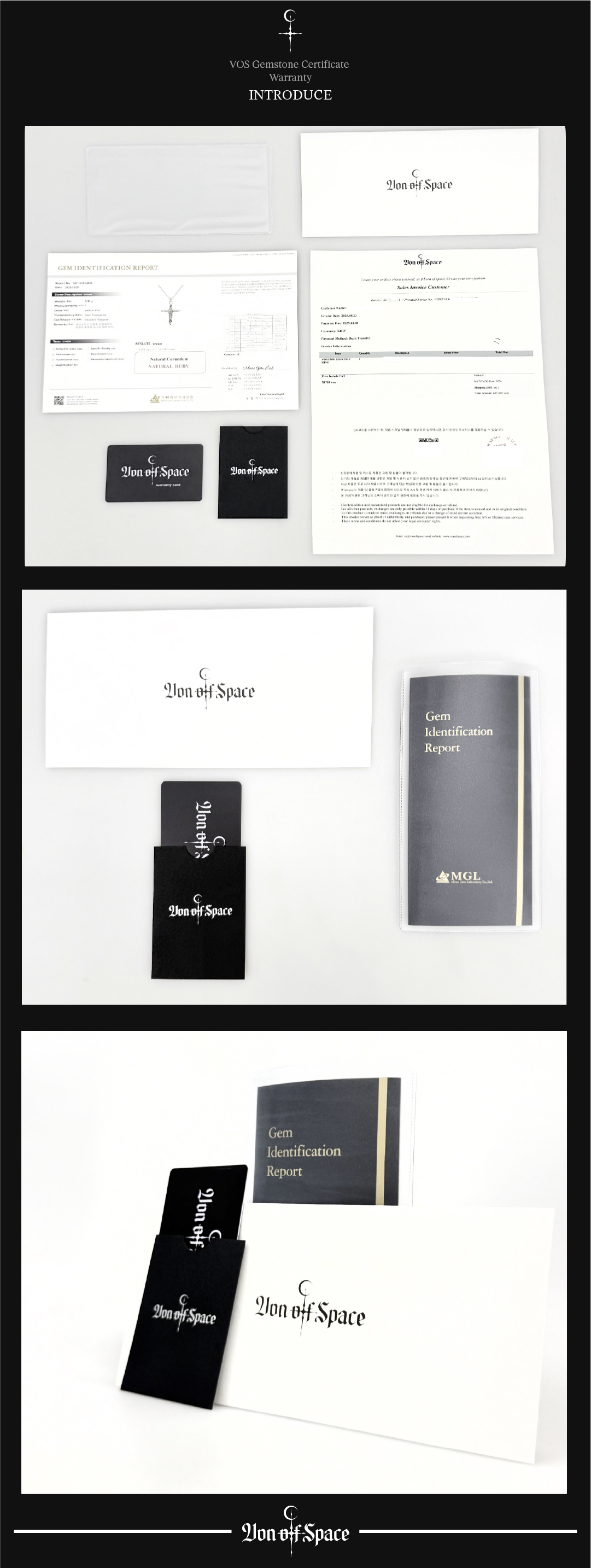 VON OF SPACE는 제품의 가치를 오래도록 증명할 수 있도록 수필 보증서 카드, 보석 감정서, 인보이스, QR 코드 온라인 보증서 등 총 4종의 정품 워런티를 함께 제공합니다.
