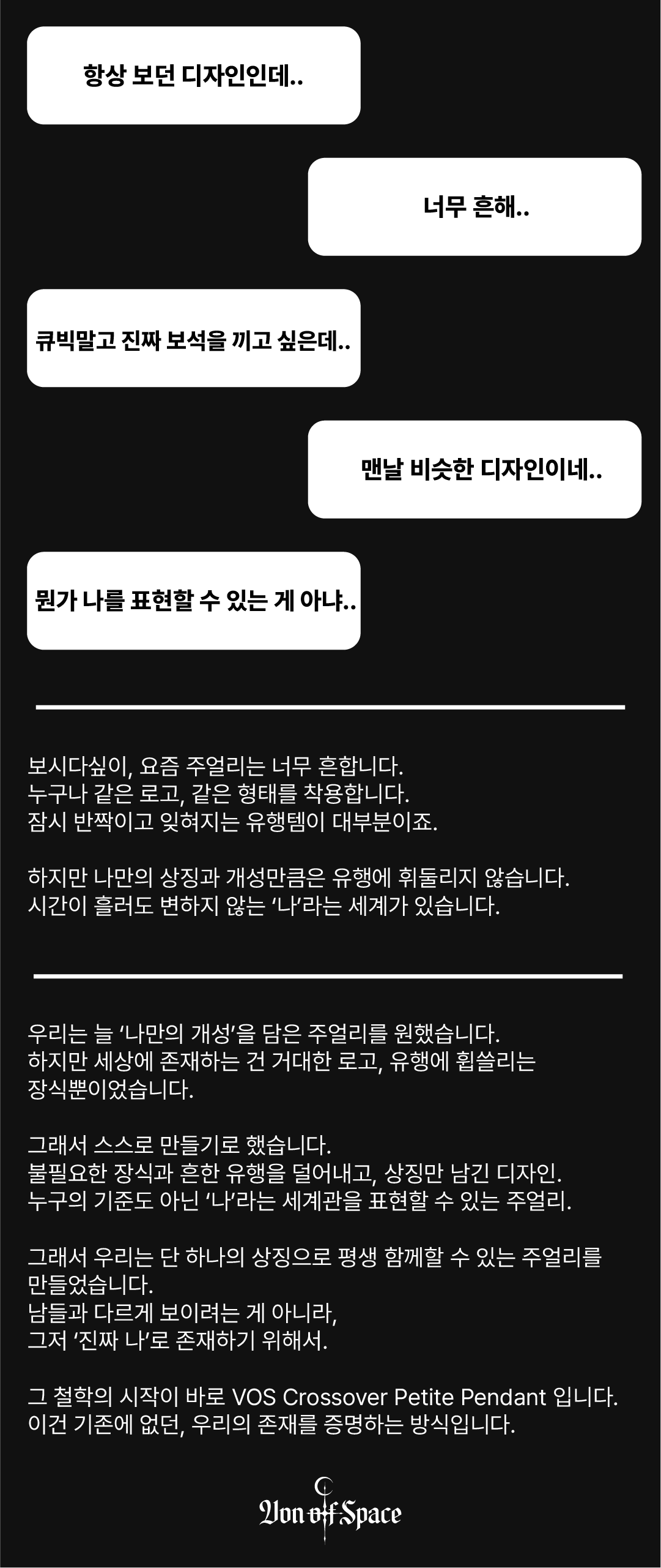 “VON OF SPACE의 창조물을 착용한다는 건, 장식을 고르는 것이 아니라 자신만의 세계관과 개성을 몸에 새기는 것입니다.”
