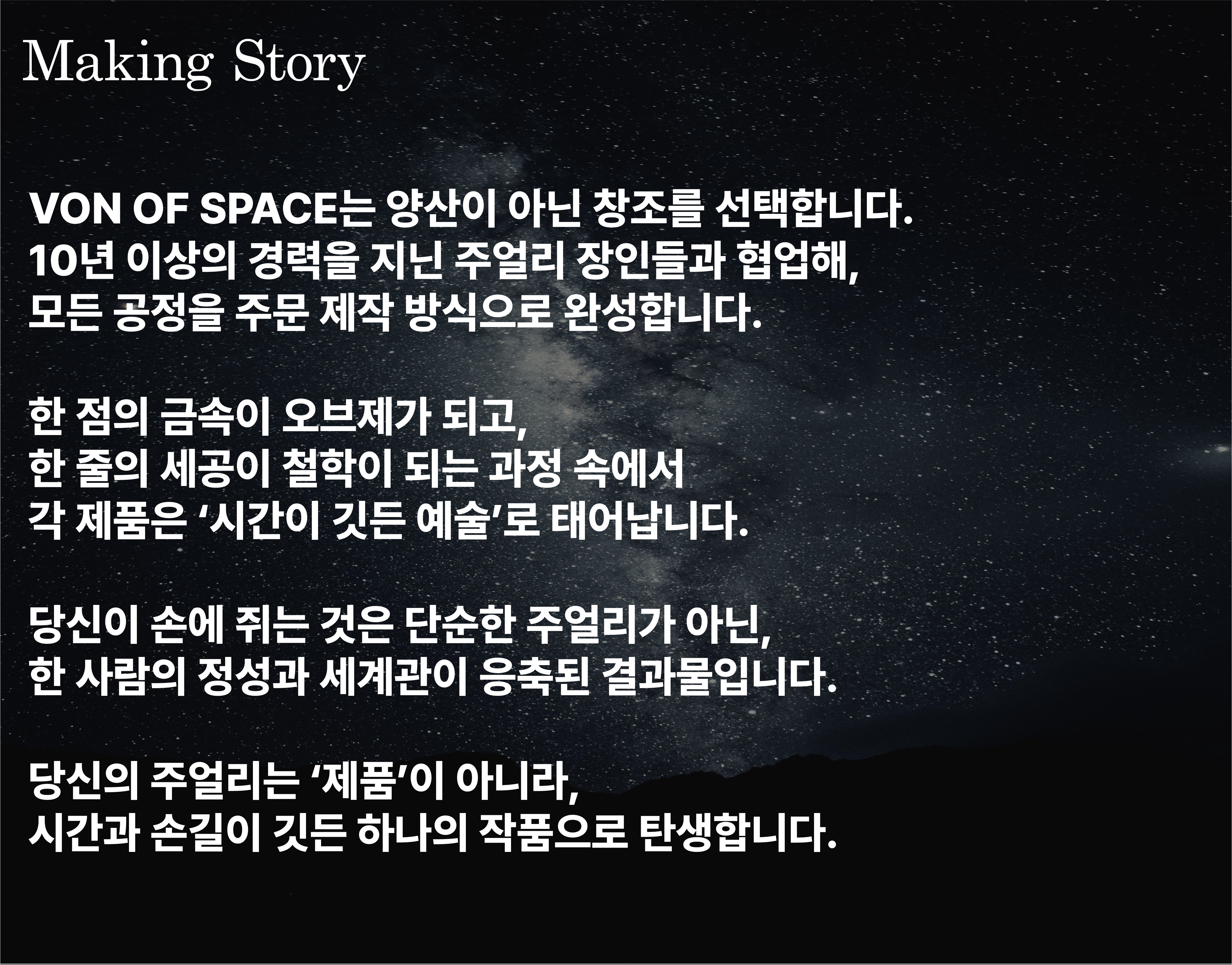 VON OF SPACE에서 제작되는 모든 것들은 세심한 수작업과 정밀한 세공 과정을 거쳐 완성되며,