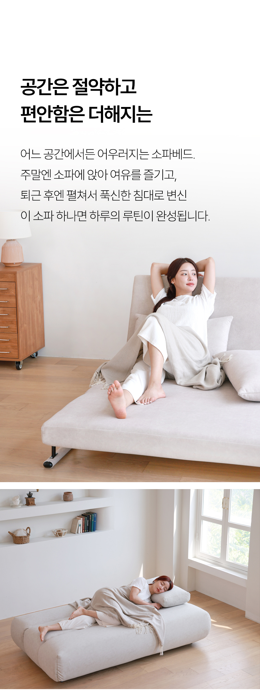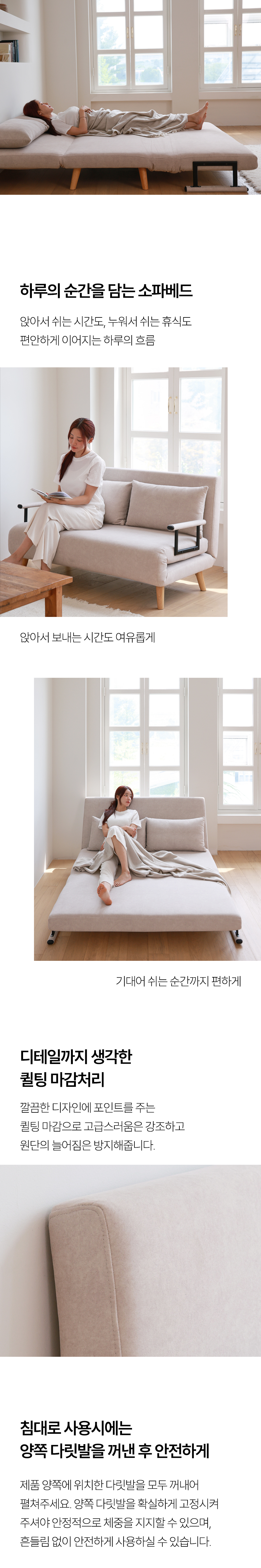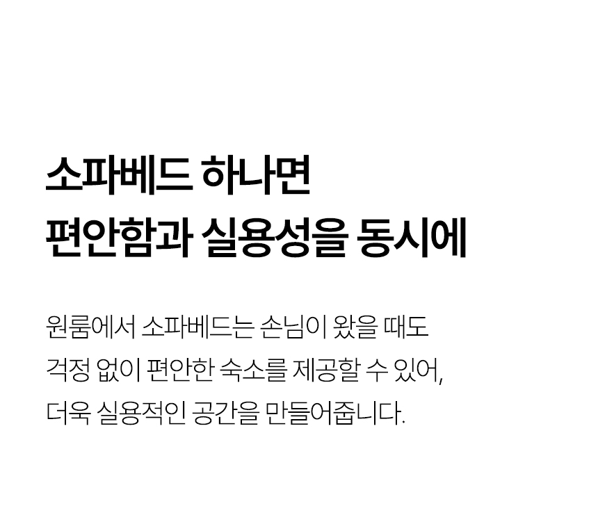 좁은 공간에서도 온전한 휴식을 누릴 수 있도록 설계된 이 소파베드는눕는 편안함을 넘어, 공간을 넓게 쓰는 효율과 일상의 편리함까지 선사하는 똑똑한 제품입니다.