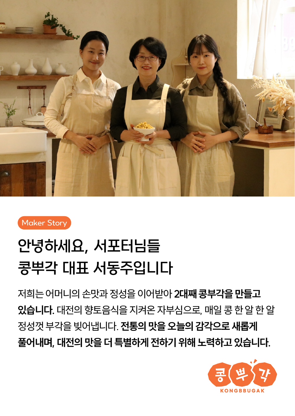 안녕하세요, 서동주 대표입니다. 저희는 어머니의 손맛과 정성을 이어받아 2대째 콩부각을 만들어오고 있습니다. 대전의 향토음식을 지켜온 자부심과 깊은 사명감으로 하나하나 정성껏 빚어내고 있습니다. 전통의 맛을 오늘날의 감각으로 재해석하며 대전의 맛을 더욱 특별하게 전하려 노력하고 있습니다.