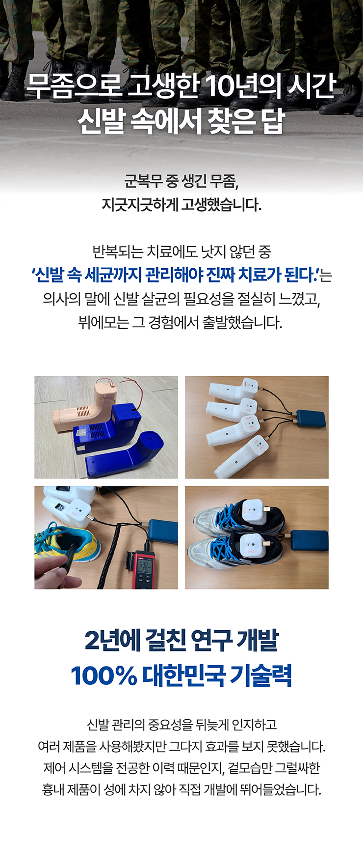 이번 프로젝트는 무좀으로 고생했던 경험을 바탕으로 근본적인 원인이 되는 신발 속의 청결 문제 해결을 통해 저와 같은 불편함을 가진 분들에게 도움이 되고 싶습니다.