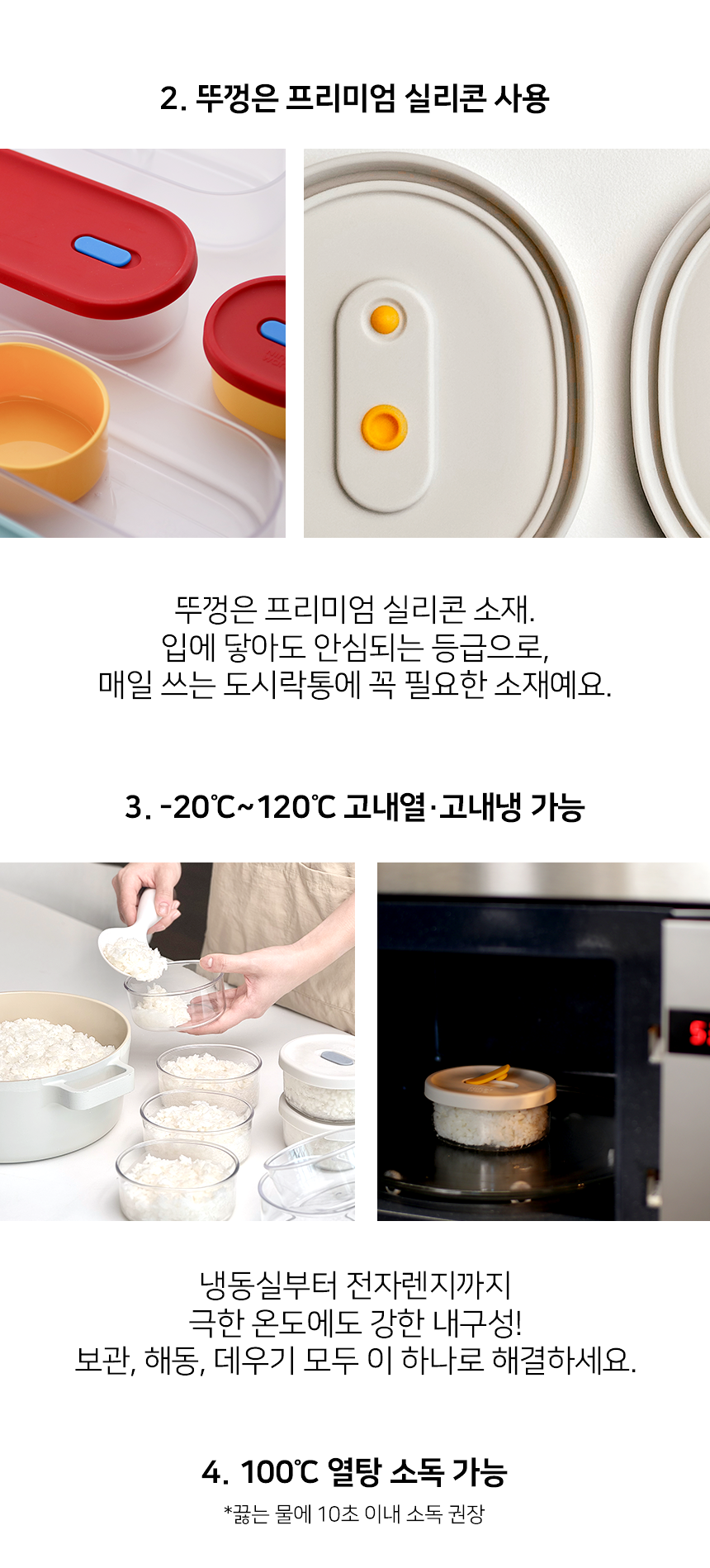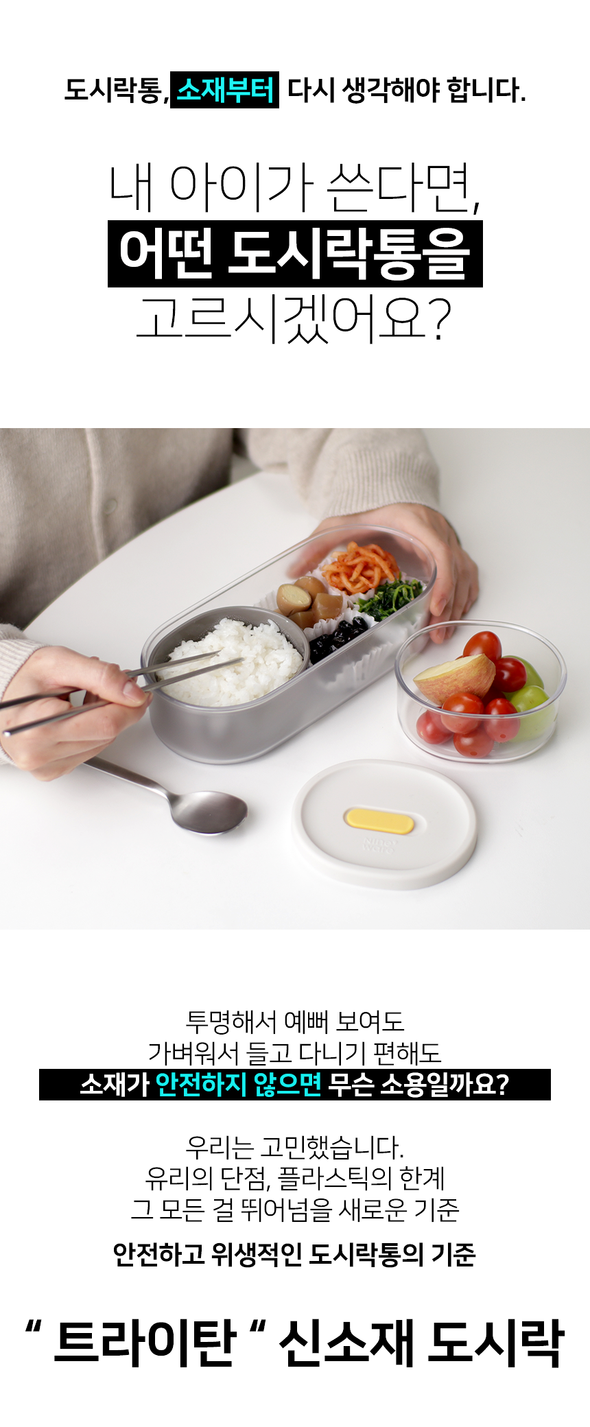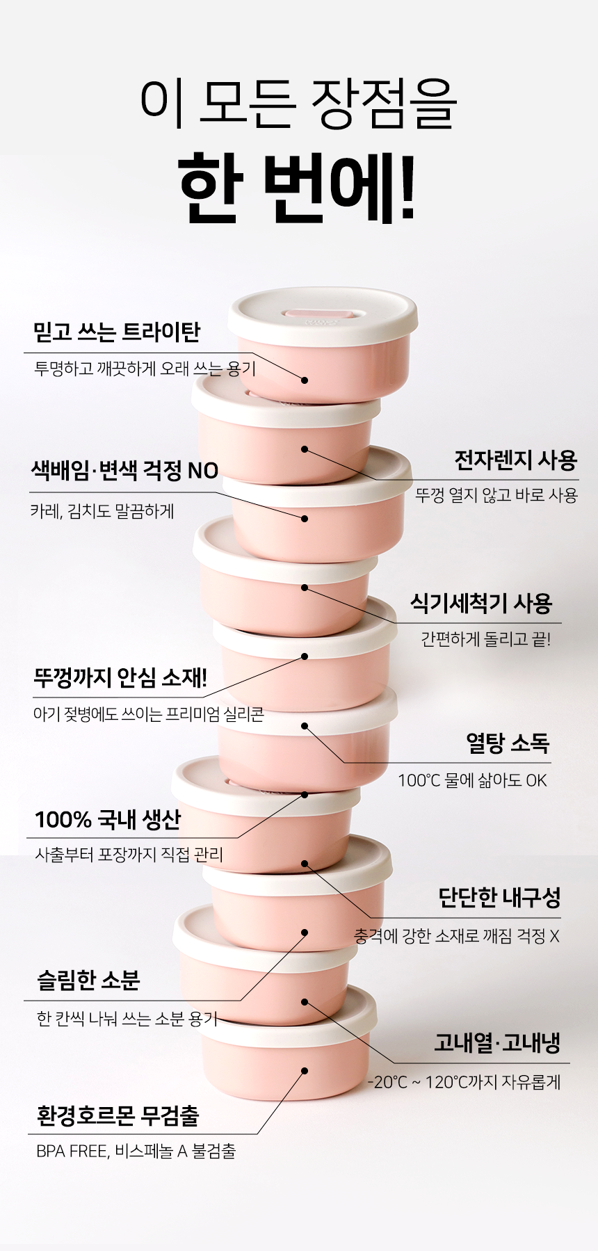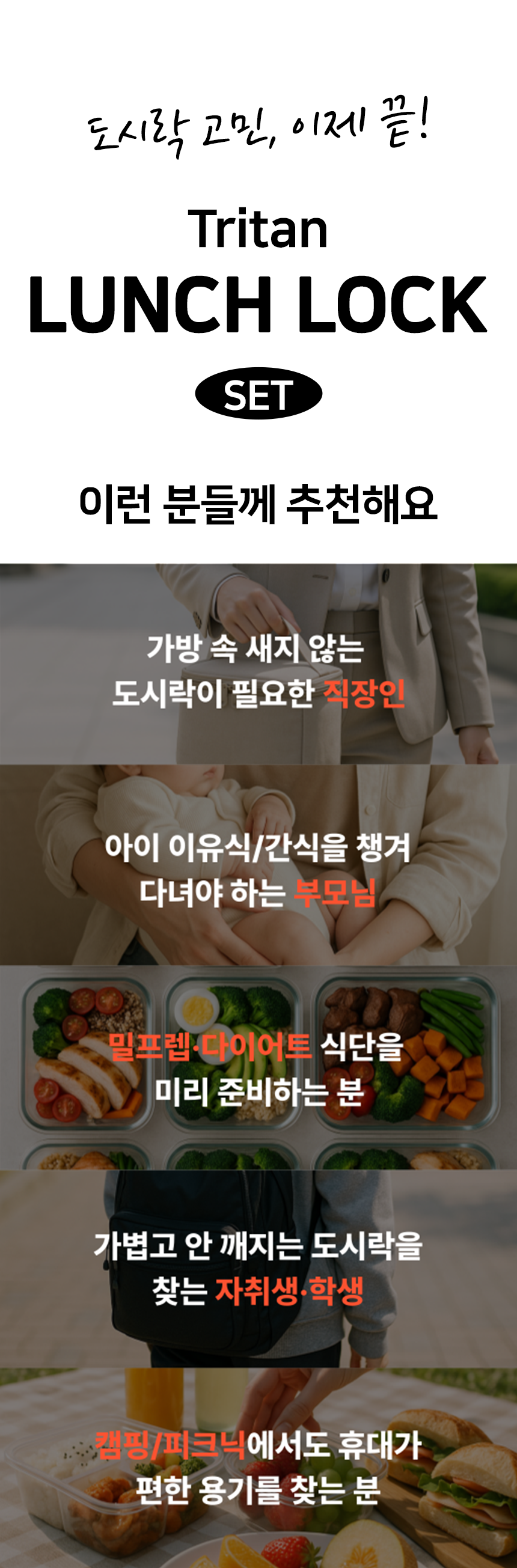 1. 🍱 트라이탄 도시락 세트 - 가볍고 내구성 강한 신소재 트라이탄 도시락 세트 2. 🛡️ 완벽 밀폐와 안전성 - 착색·냄새 걱정 없고 환경호르몬 걱정 없는 안전 소재 3. 🎁 와디즈 단독 할인 혜택 - 커스텀 컬러 조합과 최대 38% 할인된 가격 제공