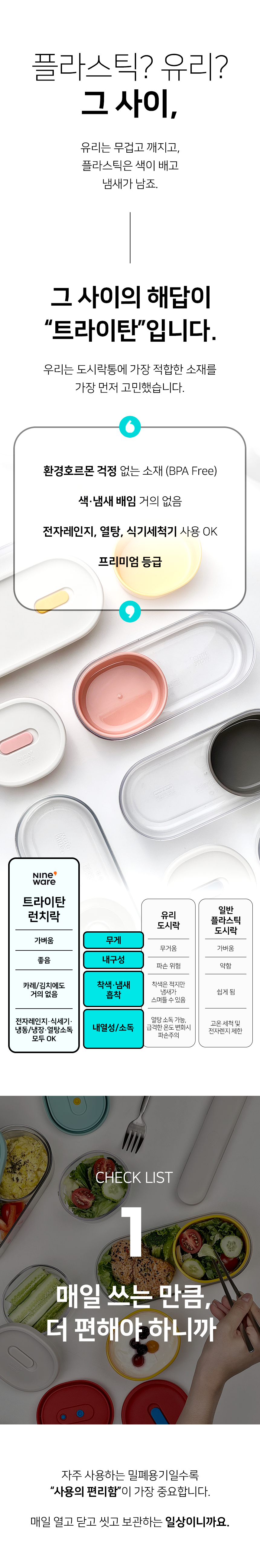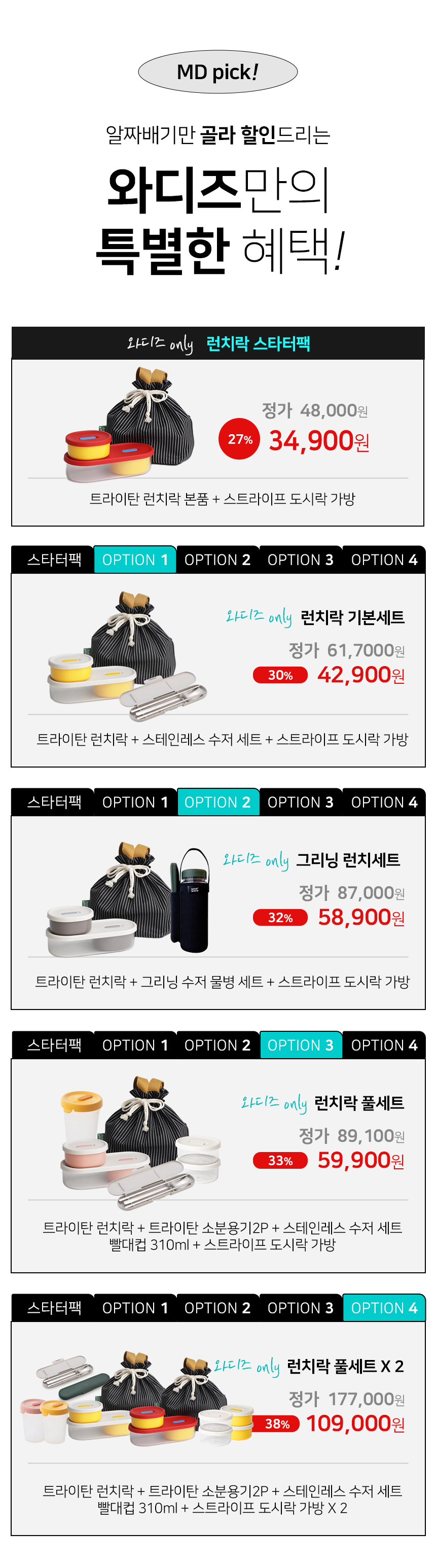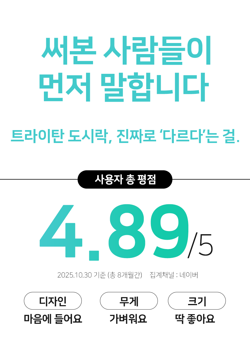 1. 🍱 트라이탄 도시락 세트 - 가볍고 내구성 강한 신소재 트라이탄 도시락 세트 2. 🛡️ 완벽 밀폐와 안전성 - 착색·냄새 걱정 없고 환경호르몬 걱정 없는 안전 소재 3. 🎁 와디즈 단독 할인 혜택 - 커스텀 컬러 조합과 최대 38% 할인된 가격 제공