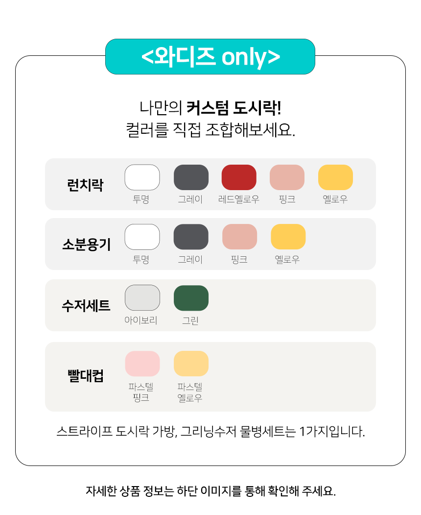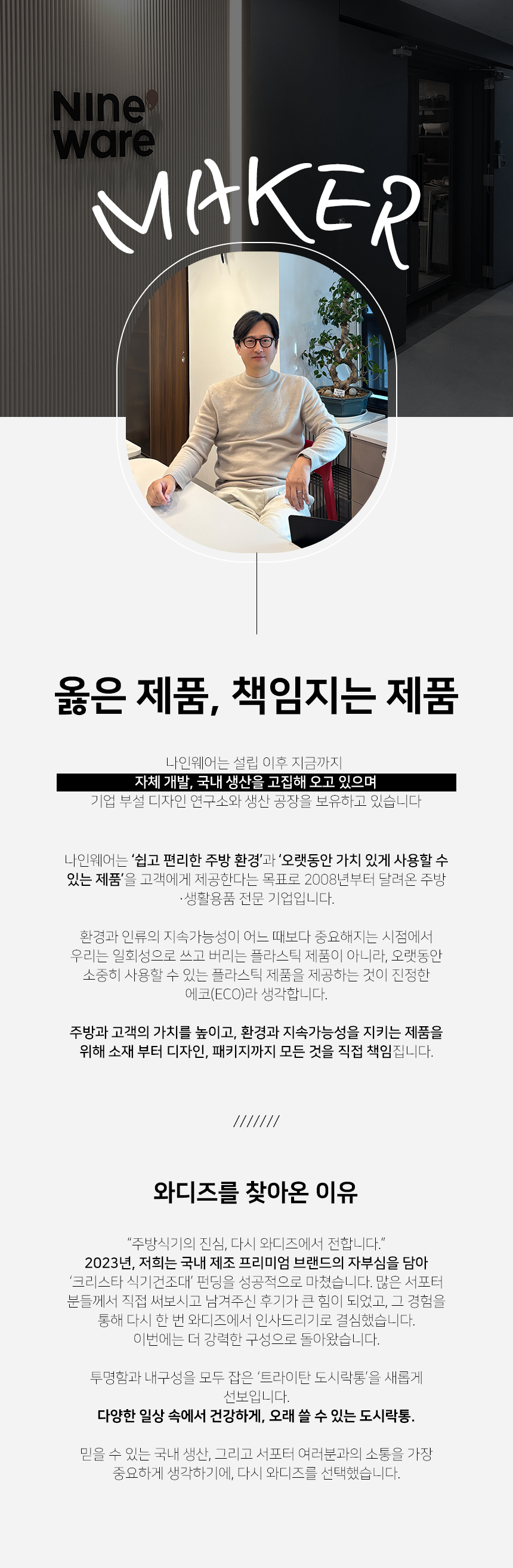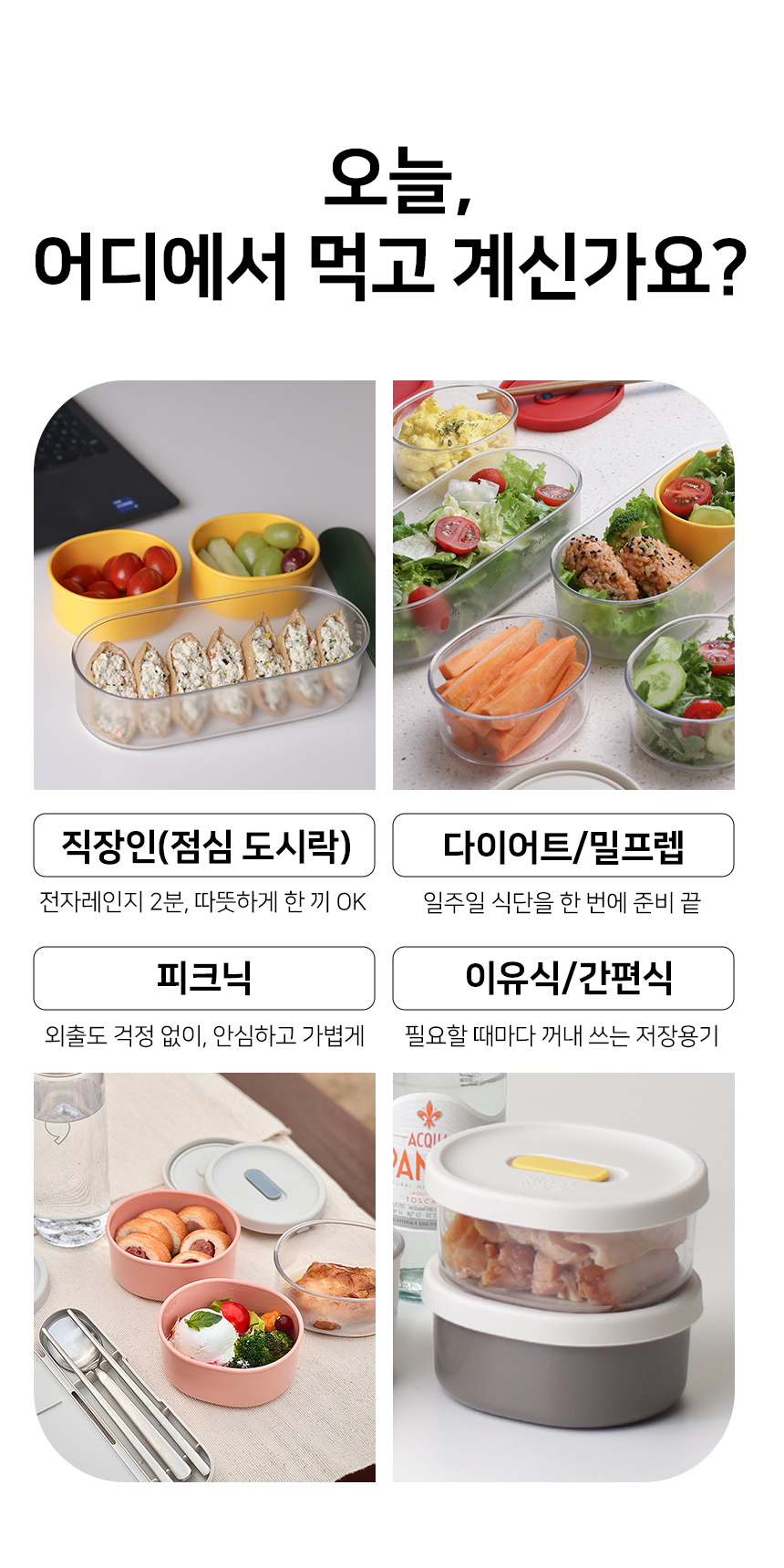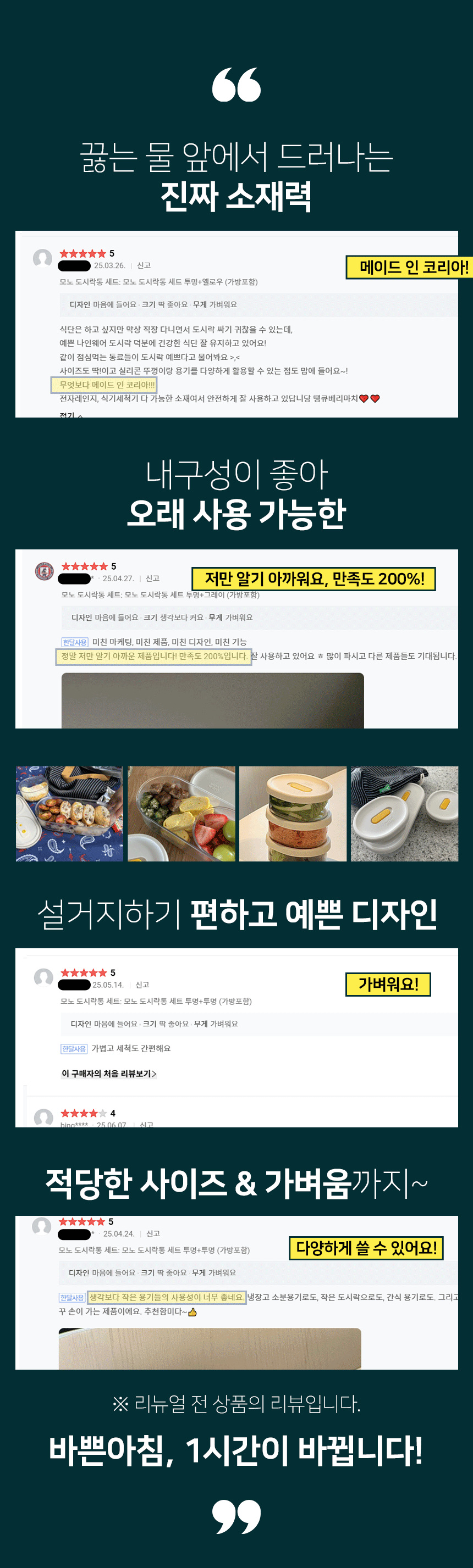 1. 🍱 트라이탄 도시락 세트 - 가볍고 내구성 강한 신소재 트라이탄 도시락 세트 2. 🛡️ 완벽 밀폐와 안전성 - 착색·냄새 걱정 없고 환경호르몬 걱정 없는 안전 소재 3. 🎁 와디즈 단독 할인 혜택 - 커스텀 컬러 조합과 최대 38% 할인된 가격 제공