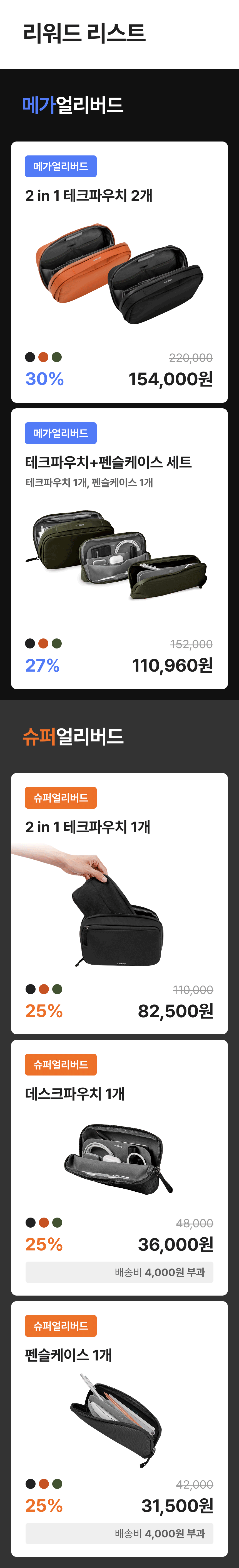 이번 와디즈 프리오더에서 모인 성공금은 서포터분들께 테크파우치가 전달되기까지(운송, 검수 등) 전 과정에 사용되며 프리오더 이후, 서포터님들을 위한 제품 AS에 필요한 비용으로 사용될 예정이에요.