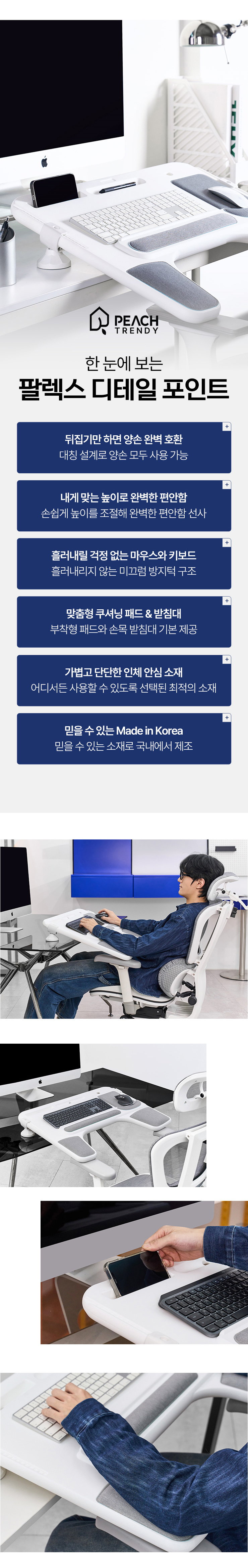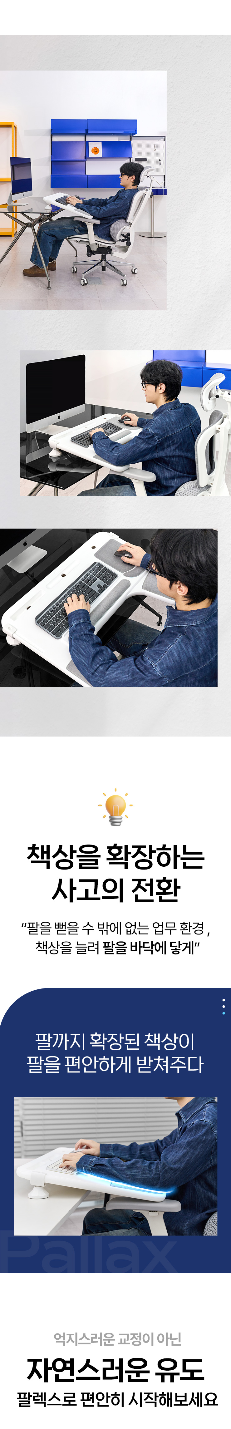 피치의 팔렉스(Pal+Relax)는 책상을 의자의 팔걸이까지 위까지 확장해 팔꿈치를 안정적으로 지지함으로써, 장시간 업무 시에도 근골격계 부담 없이 편안함을 유지해 주는 혁신적인 데스크 익스텐션 제품입니다.