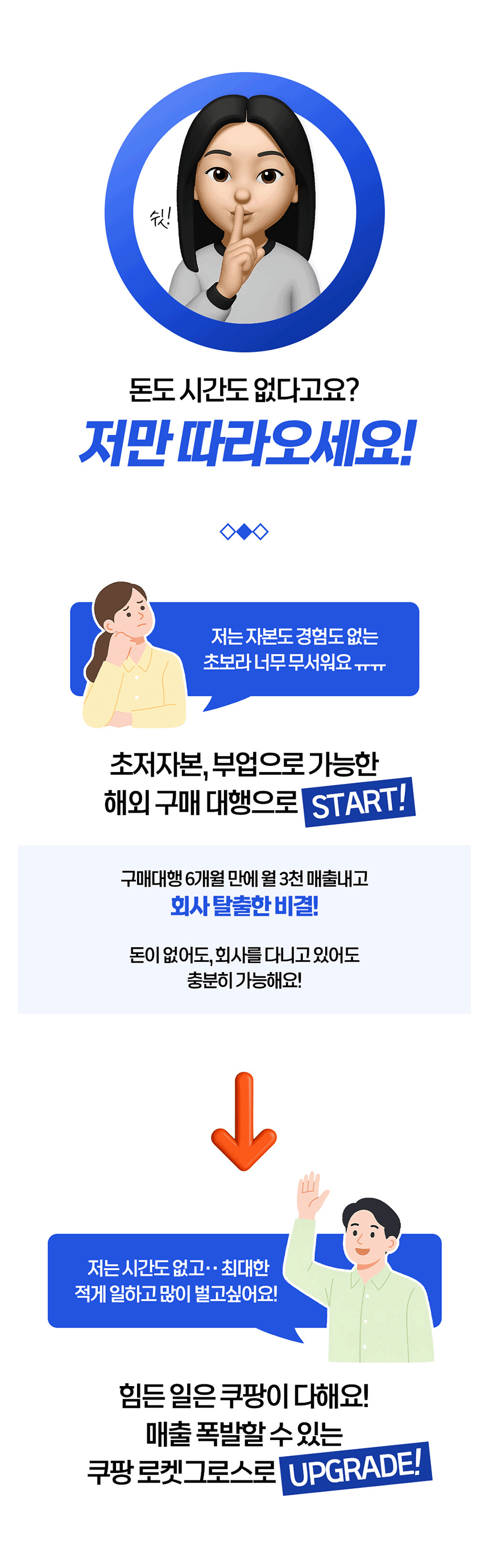 ㄴ 네 많이 다릅니다 해외 구매대행은 해외에서 제품을 대신 구매해주는 방식이고 로켓그로스는 판매할 제품을 미리 쿠팡 센터에 넣어두고 주문이 들어오면 쿠팡이 발송하는 방식이에요. 더 자세한 차이점 등은 리워드를 구매하시면 상세히 아실 수 있답니다. 아무것도 모르고 자본도 없는 초보는 해외구매대행으로 시작하면 좋고 어느정도 자본이 있거나 지식이 쌓였다면, 혹은 이미 자본이 있다면 중국사입으로 쿠팡 로켓그로스를 시작했을 때 빠르게 매출을 늘릴 수 있어요!