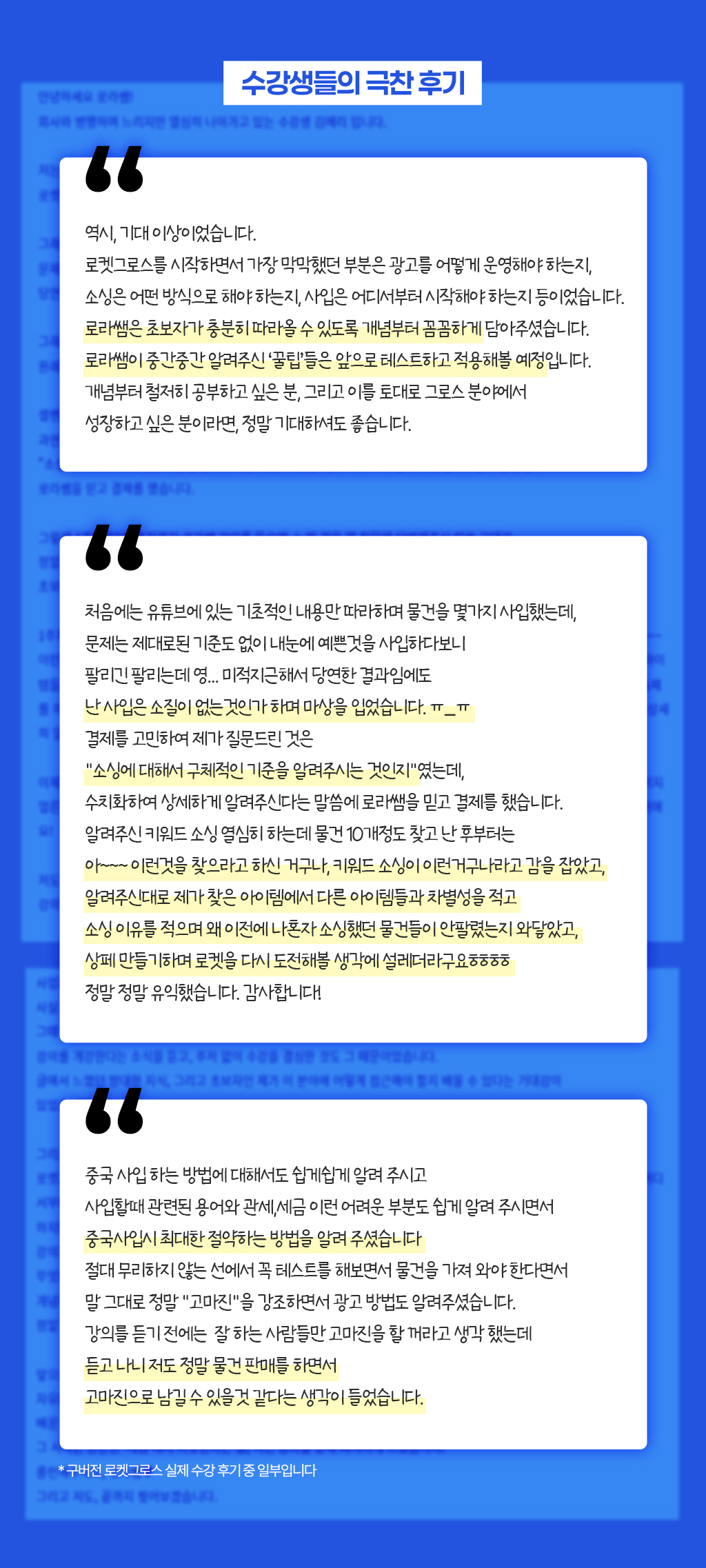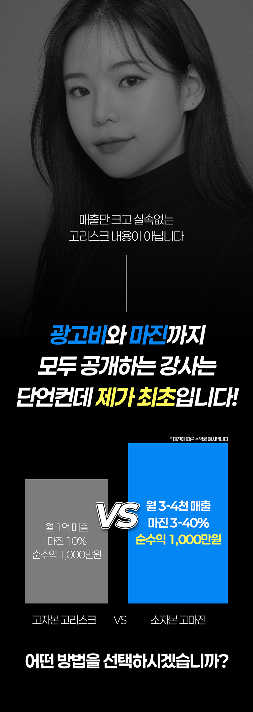 수 년간 구매대행, 중국사입, 마케팅 강의를 하면서 느낀 바가 많아요. 많은 분들이 비용 때문에 고민하시지만 정작 비싼 강의도 제대로 완강조차 하지 않는 사람이 태반이에요! 비싸다고 그 가치를 제대로 누리는 사람이 많지는 않아요 오히려 가격이 비싸면 돈이 없지만 정말로 실행하고 싶은, 절실한 분들께는 허들만 될 뿐이죠.