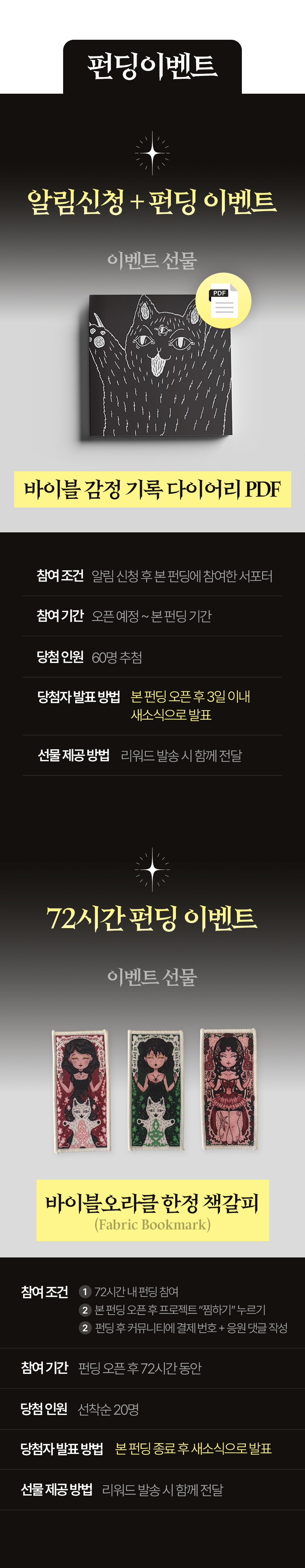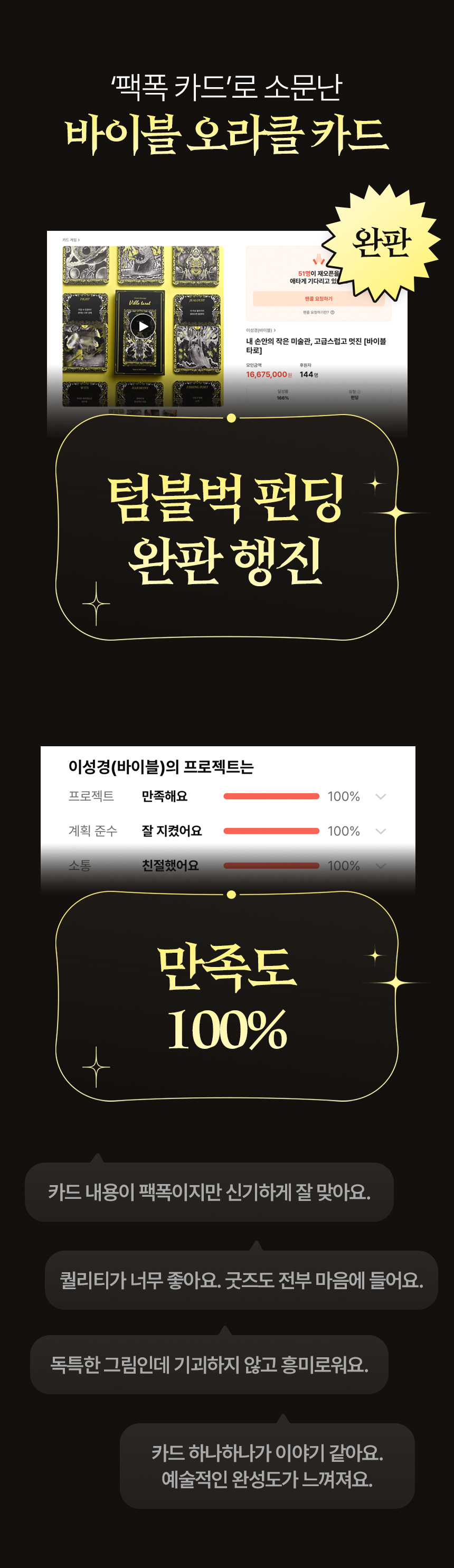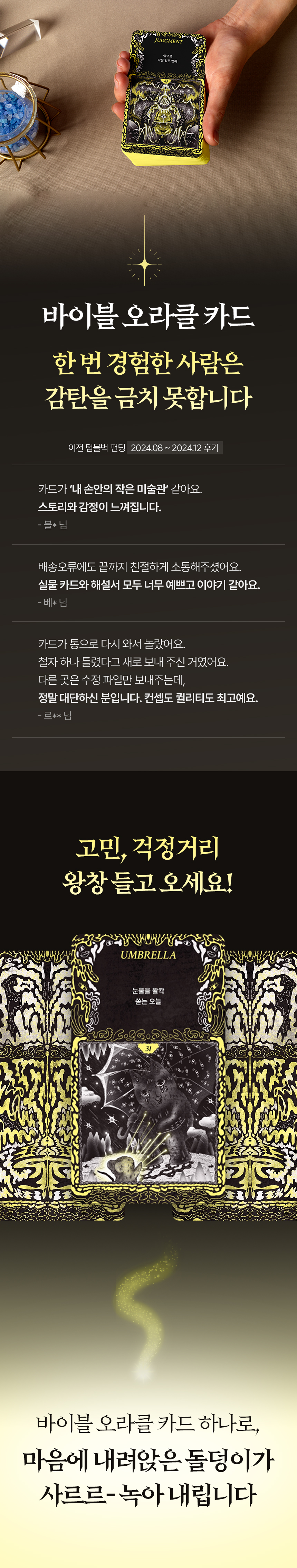 이번 와디즈 펀딩은 그동안의 연구와 기록을 공식 제품화하는 첫 여정입니다. 이 프로젝트를 통해 디자인과 예술, 영성을 연결한 새로운 감정 예술 브랜드로 나아가고자 합니다. 바이블 오라클은 누군가에겐 단순한 카드지만, 저에게는 생존기이자 부활의 기록입니다. 여러분이 힘든 순간, “괜찮아, 아직 살아 있잖아”라고 말하는 이 카드 한 장이 힘이 되길 바랍니다.