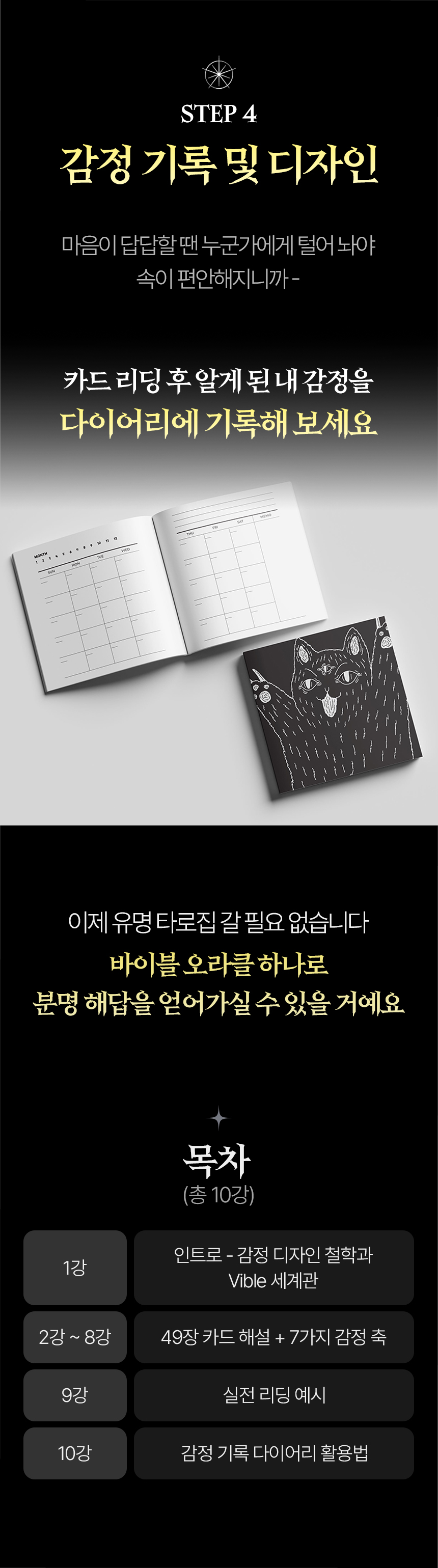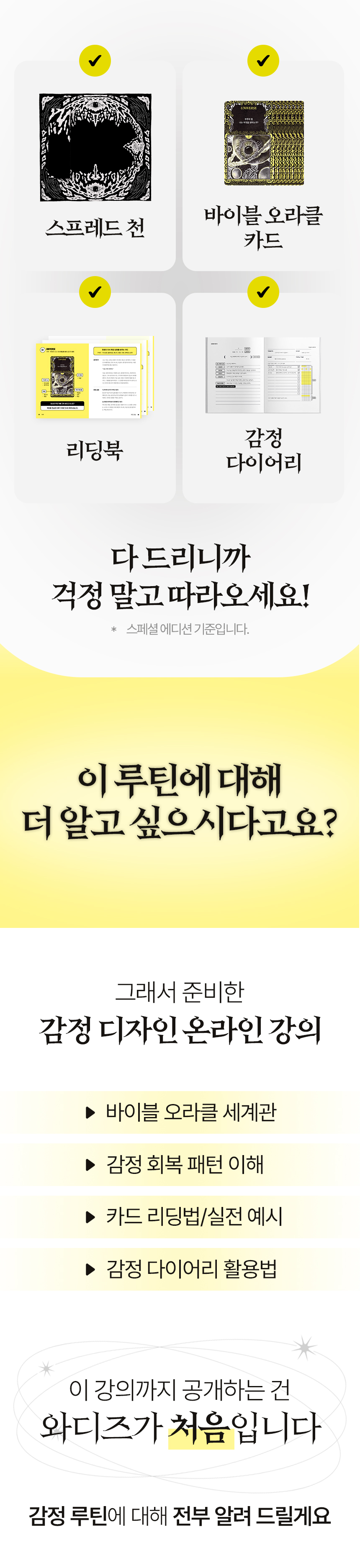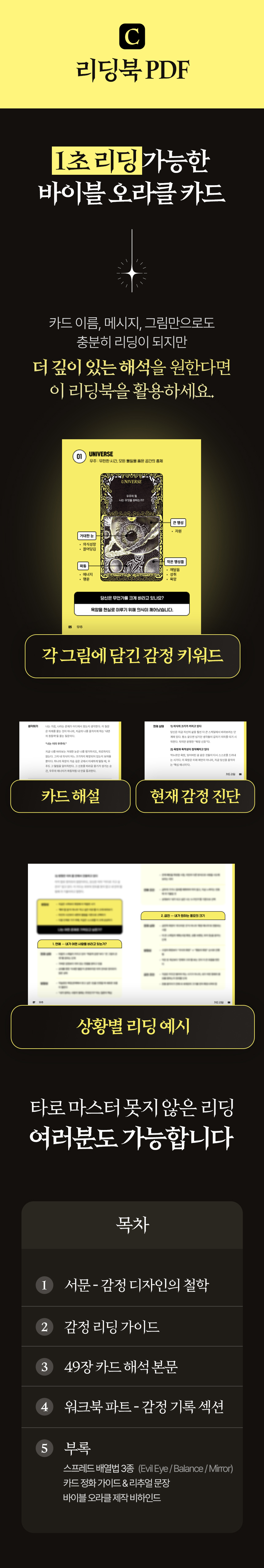A. ‘Vible Oracle Tarot’는 초보자도 쉽게 감정 리딩을 시작할 수 있도록 구성되었습니다. 리딩북 PDF와 온라인 강의(VOD)를 통해 49장의 카드별 해석 및 실전 리딩 문장을 단계별로 안내해드립니다.