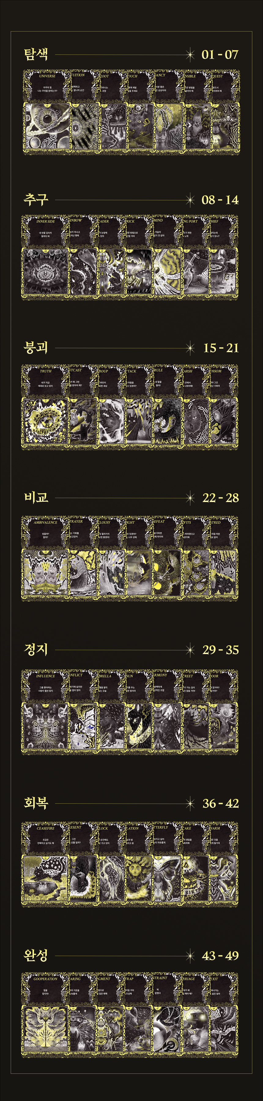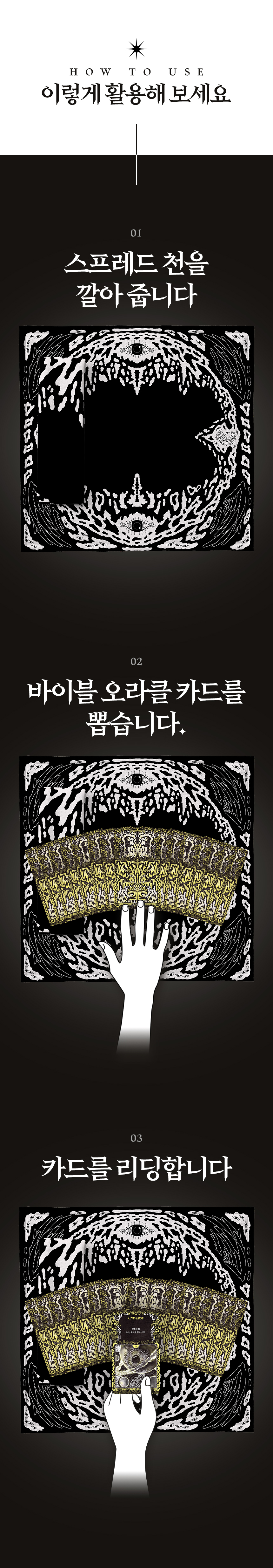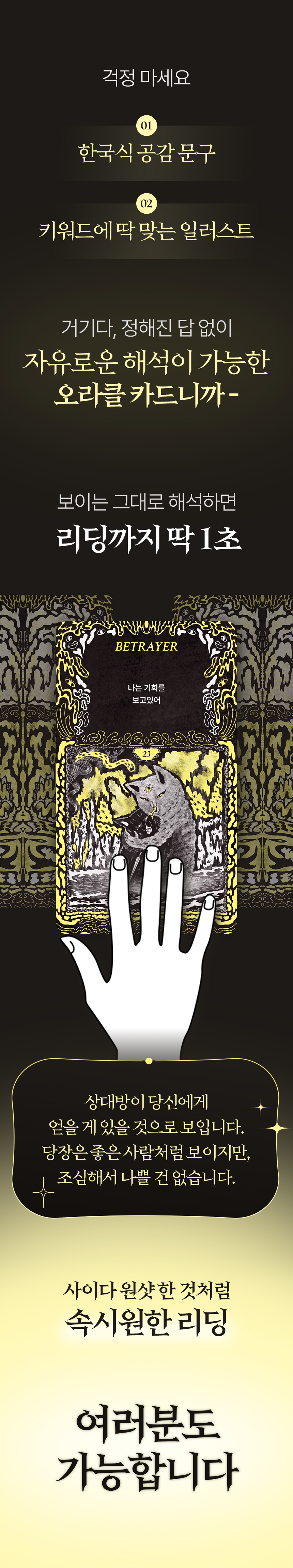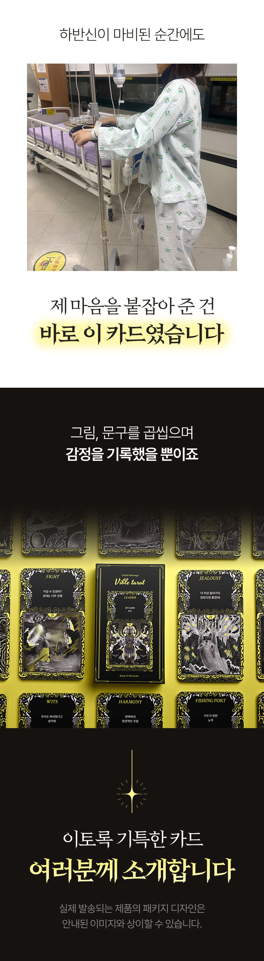 이 카드는 척추 수술 후 하반신이 마비됐던 제 정신을 붙잡아 준 기적 같은 도구입니다. 걷는 건 물론, 앉아서 그림을 그리는 것조차 어려웠던 그 시간 속에서 '이 카드의 문장과 이미지'를 보며 버텼습니다. 그때 깨달았습니다. 이건 예언의 도구가 아니라, ‘살아 있음을 증명하는 언어’라는 것을요. 지금도 개정판을 만들면서 그 시절의 상처를 다시 마주하고 있지만 이번에도 도망치지 않고 버텨 내고 있습니다.