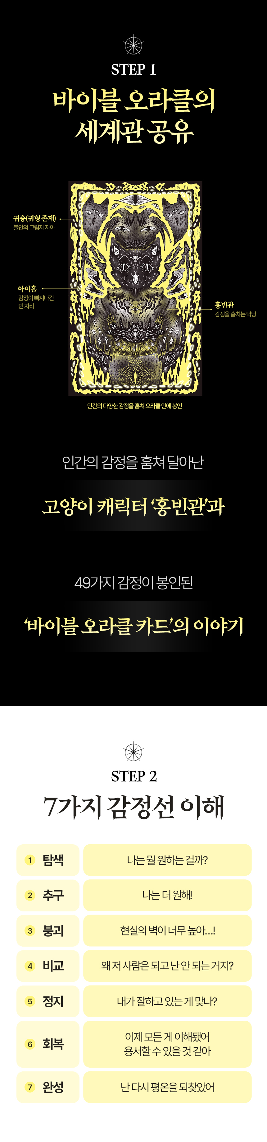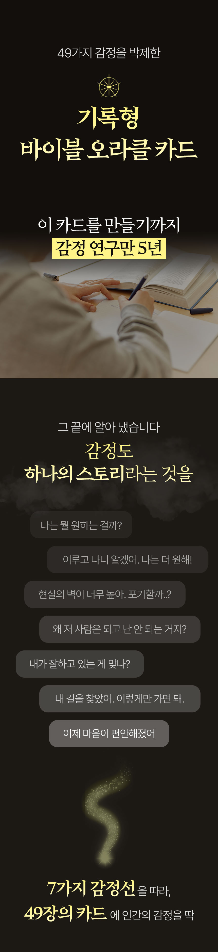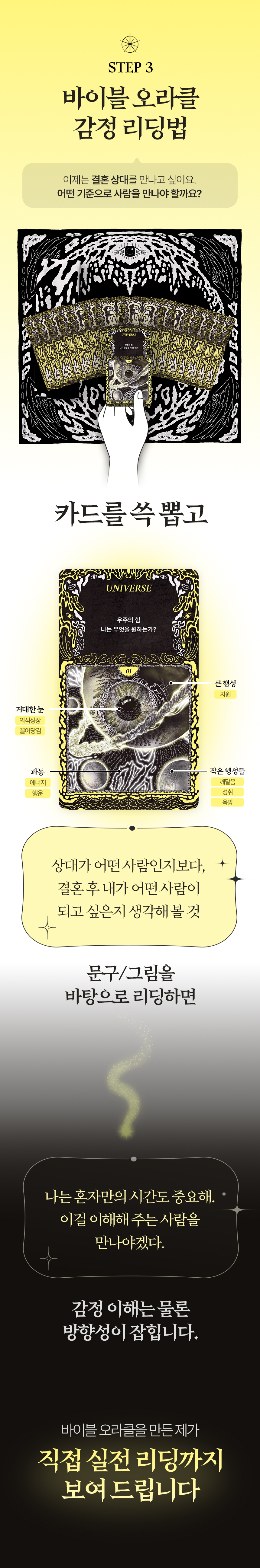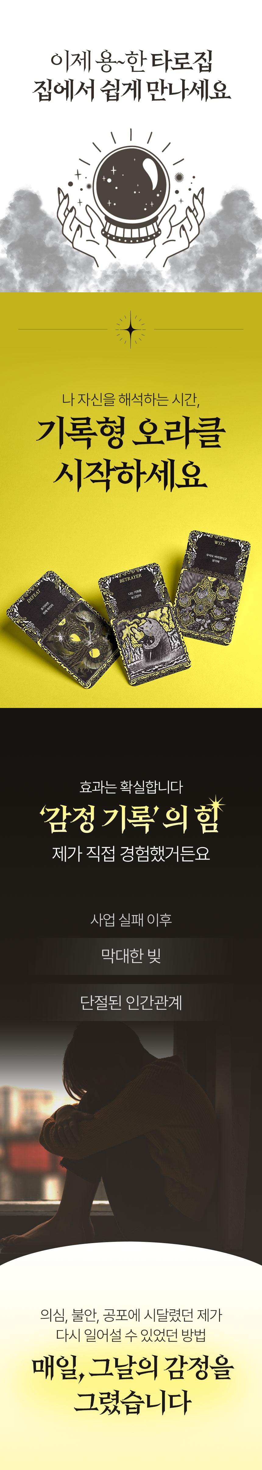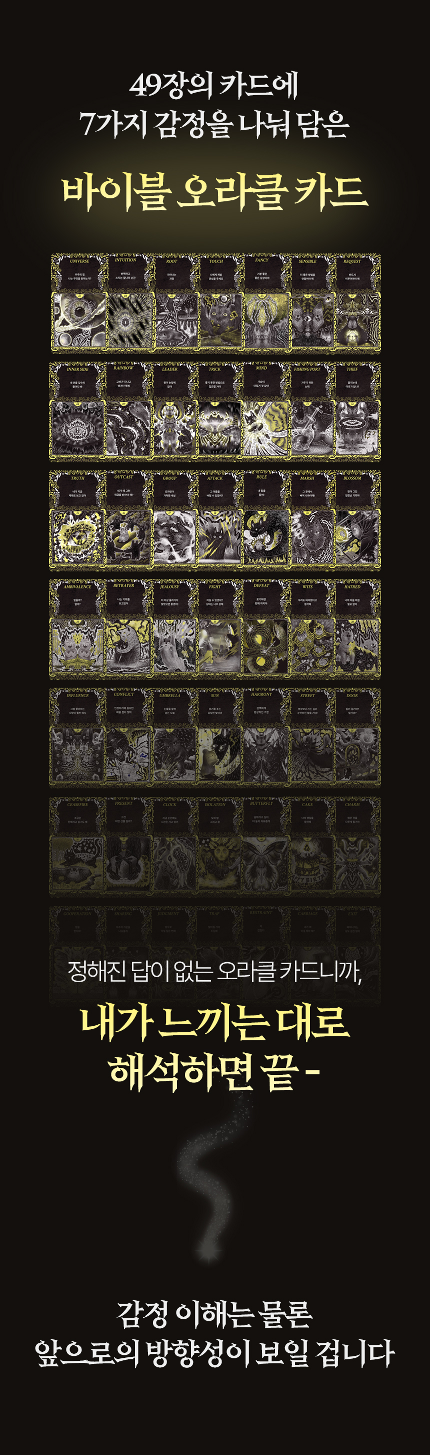 바이블 오라클 타로는 단순한 타로 카드가 아닙니다. 이 카드는 제 인생의 가장 어려웠던 시기에 만들어졌는데요. 사업이 무너지고 모든 것을 포기하고 싶었던 시기, 한 달 넘게 방을 나오지 않은 채 어둠 속에서 침대 생활을 고집했습니다. 침대 위에서 한 일은 오직 한 가지, 매일 ‘오늘은 어떤 감정을 느꼈는가’를 그림으로 기록했습니다. 그 기록이 바로 49장의 오라클 카드가 되었습니다.