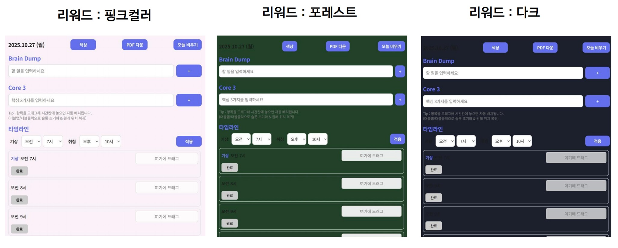 많은 시간관리 앱이 화려하지만, 결국 복잡한 기능으로 잘 쓰지 않는 것을 보고 “정말 단순하지만, 쓰기 쉽고 꾸준히 사용할 수 있는 도구는 없을까?”라는 생각을 했습니다.