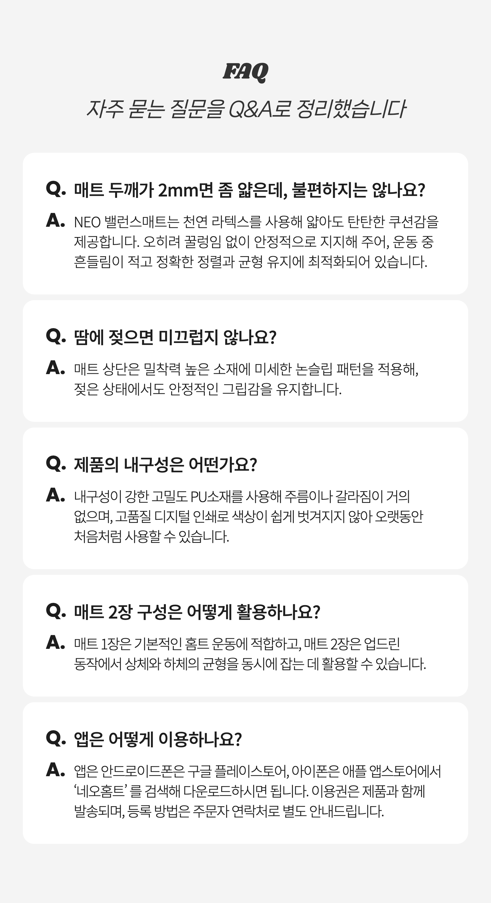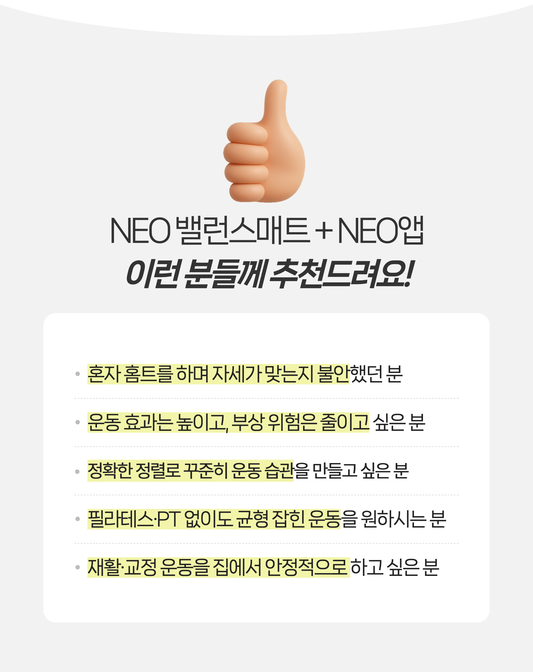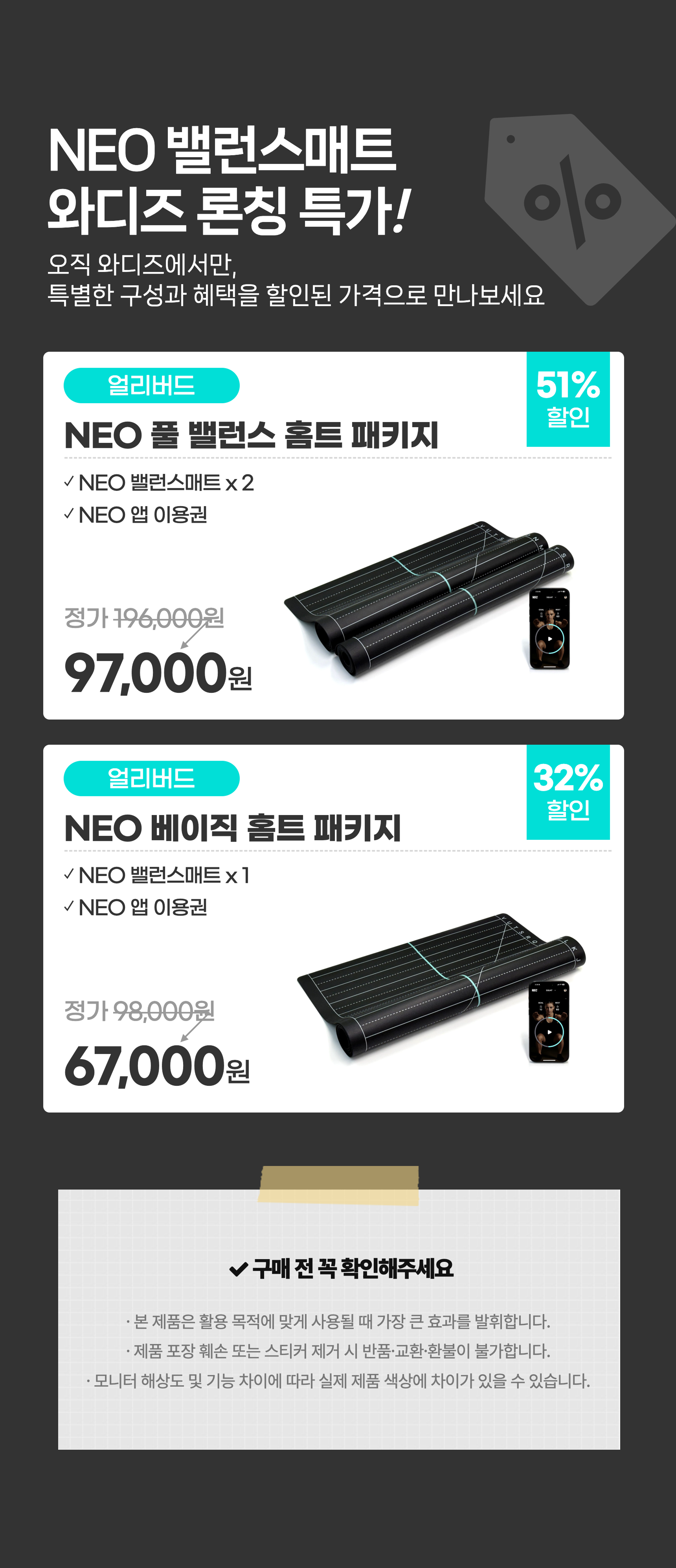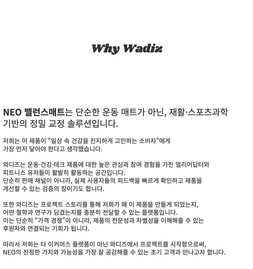1. 🧘♂️ NEO 밸런스매트 운동 솔루션 - 손끝·발끝 균형 교정, 정밀 홈트레이닝 지원 2. 🔬 재활·스포츠과학 기반 설계 - 전문가 협업, 과학적 접근으로 신체 불균형 개선 3. 🎁 와디즈 단독 얼리버드 혜택 - 매트 2개와 앱 이용권 포함 51% 할인 제공